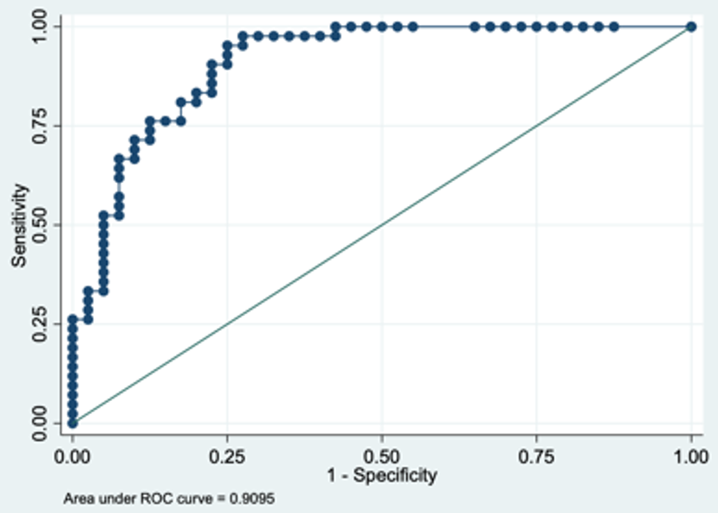 ROC解析によるドライアイリズム®のドライアイ診断精度は、ROC曲線下面積が0.910であり、最大開瞼時間の最適なカットオフ値は21.4秒で、その際の診断精度は感度71.4%、特異度87.5%であった。
