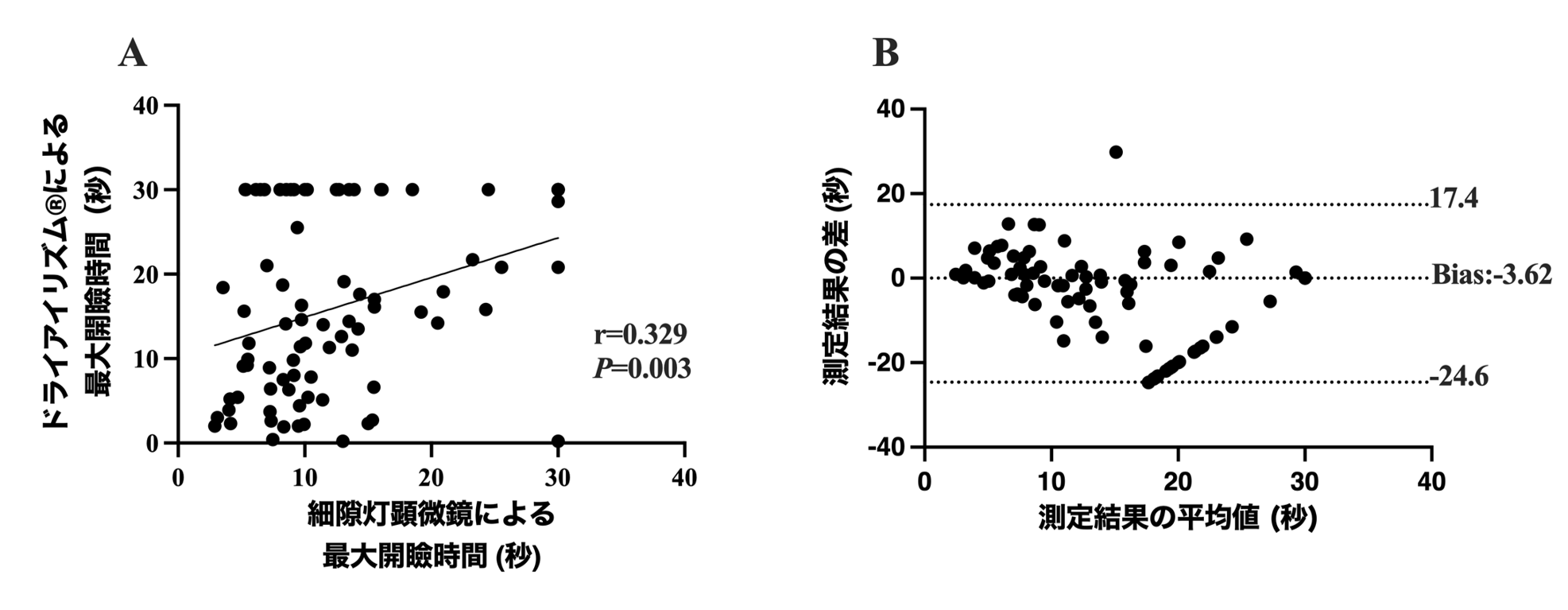 さらに、最大開瞼時間の測定結果に関する相関及び一致性に関しては、細隙灯顕微鏡およびドライアイリズム®による測定結果の間に有意な正の相関を認め(Pearson相関分析、 r=0.329、P=0.003) (図4A)、Bland-Altman分析による一致性の評価では、細隙灯顕微鏡による測定結果に対するドライアイリズム®による測定結果のバイアスは-3.62秒(95%許容範囲: -13.8から21.7)(図4B)でした。