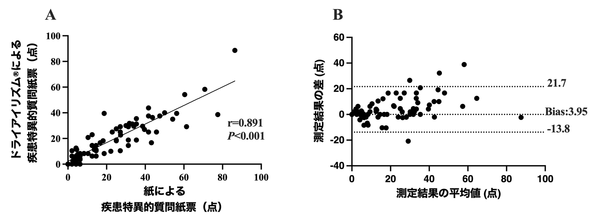 (A) 紙およびドライアイリズム®による測定結果の間のPearson相関分析。