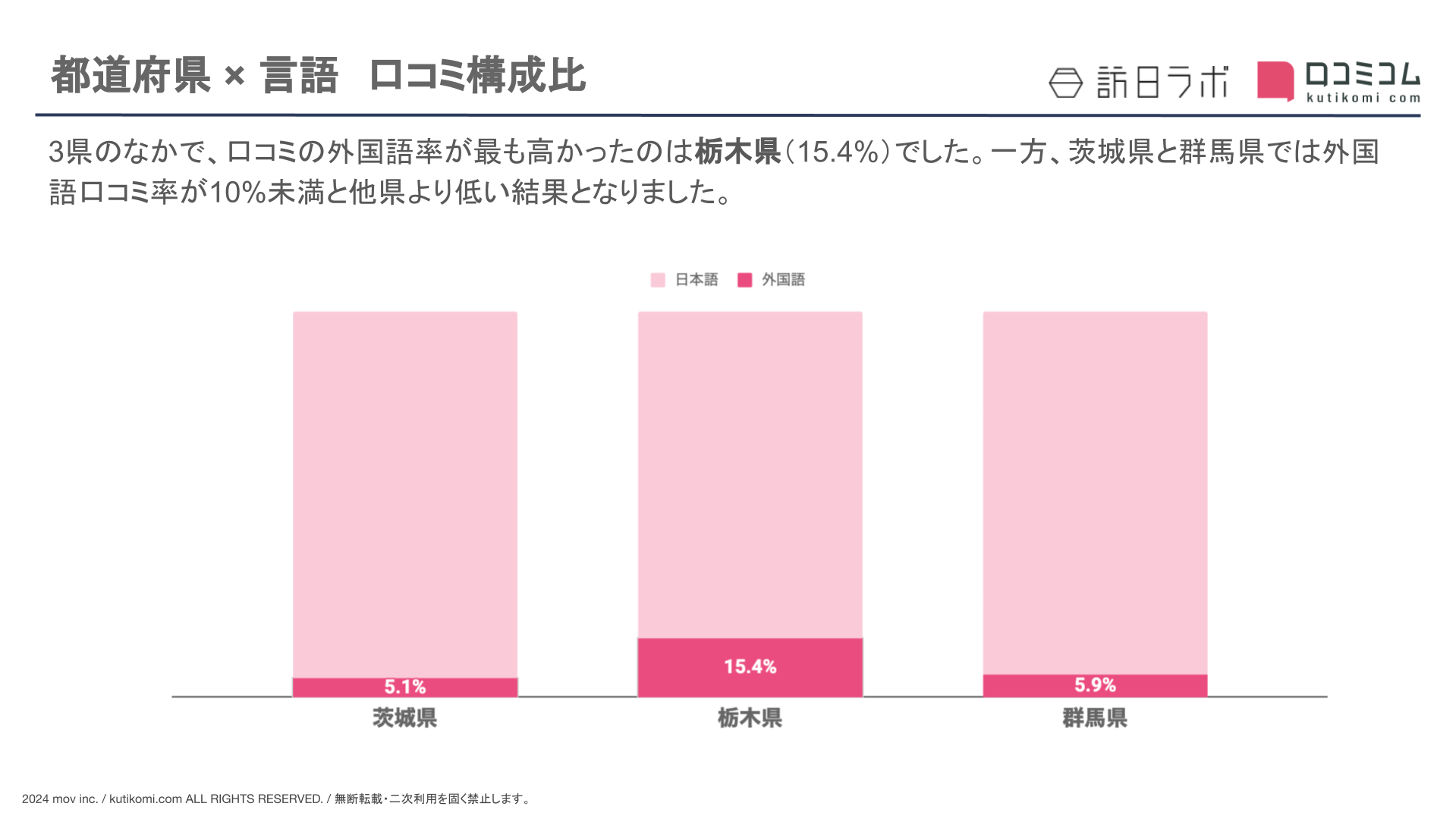 3県のなかで、口コミの外国語率が高かったのは栃木県(15.4%)でした。一方、茨城県と群馬県は外国語口コミ率が10%以下と他県より低い結果となりました。