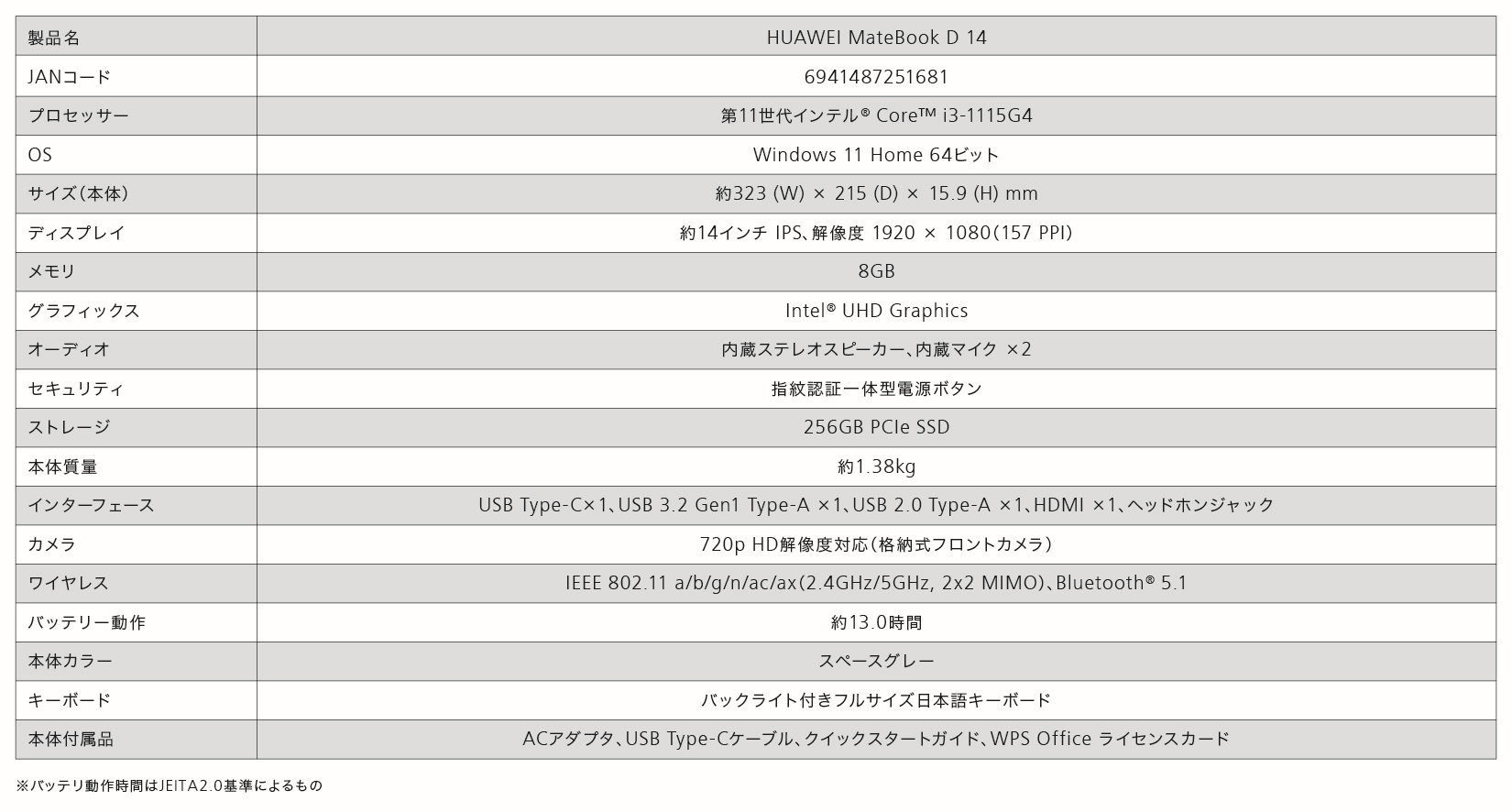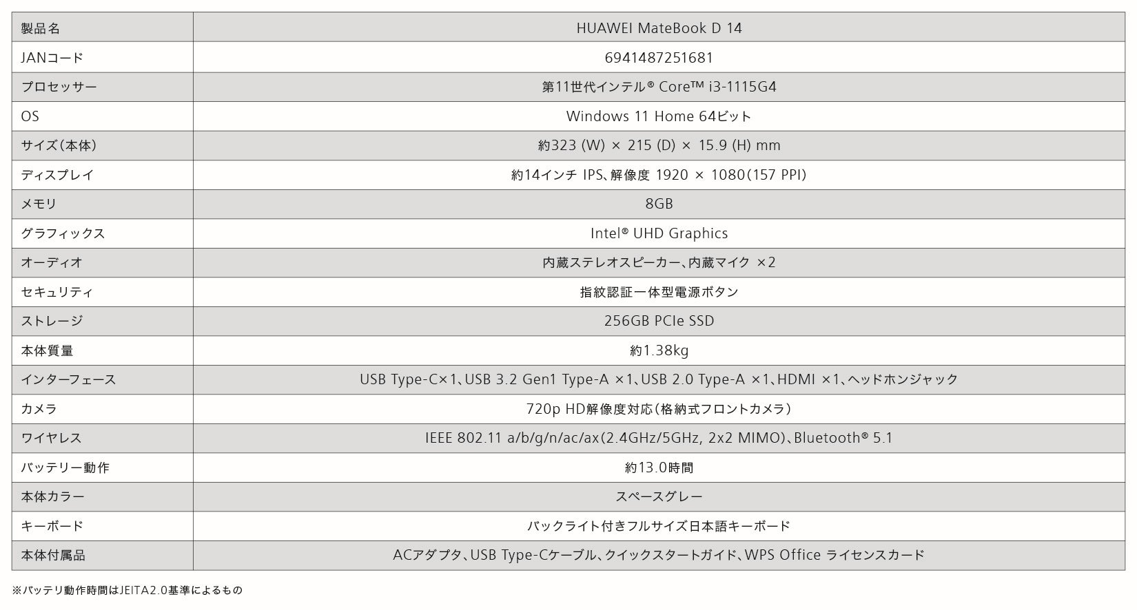 『HUAWEI MateBook D 14 2022』 新モデルの主な仕様