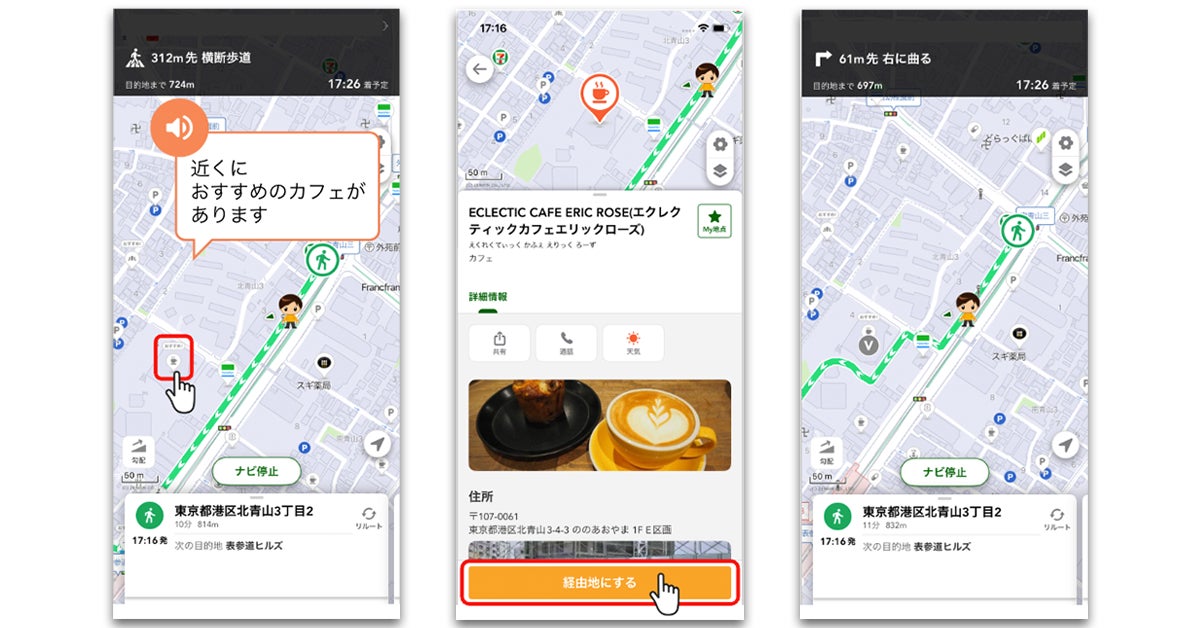 『NAVITIME』では安心・安全に移動できるよう、音声にて進行方向や道順、目印となる建物、駅入口など、きめ細やかな案内が可能です。今回の「おすすめスポットナビ」機能では、近くのおすすめスポットをユーザーに周知することで、その場所に行ってみたいといった興味を持ち、おでかけを楽しんでいただける機会に繋がればと思います。