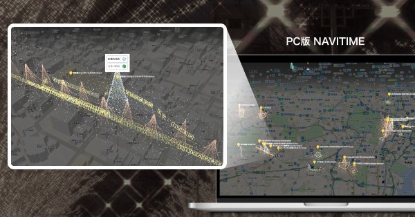 なお、「イルミネーションマップ」は、PC向け『NAVITIME』Web版の地図機能にも追加し、地図画面右上から選択することでご利用いただけます。それぞれのイルミネーションの色合いや、シンボルとなるようなツリーやオブジェのモチーフも立体的に再現しています。これらのイルミネーションスポットは、フリーワード検索ボックスからも検索することもできます。