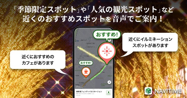 これまで『NAVITIME』アプリでは、進行方向や道順、目印となる建物など、ナビゲーションに関する音声ガイダンスのみでしたが、本機能にて季節に応じた案内ができるので、例えばイルミネーションを眺めながら散歩するなど、新たなおでかけ場所の発見や立ち寄りのきっかけとして、移動の楽しみを提供できればと思います。今後春は桜、秋は紅葉など、その季節ならではのスポットを案内する予定です。