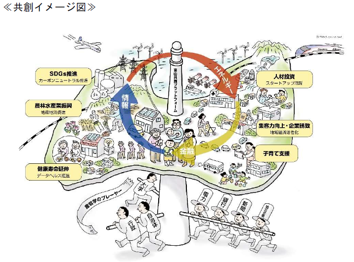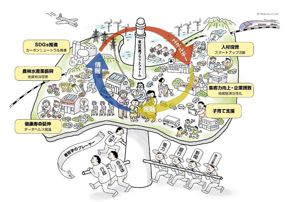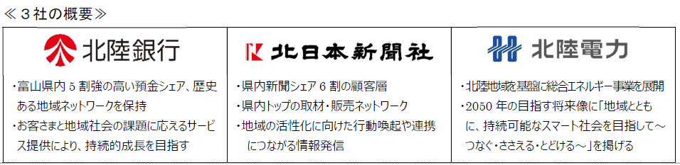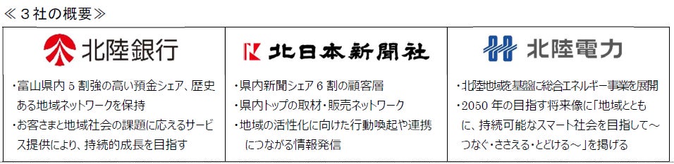 3社が長年培ってきた事業基盤の活用・連携により、地域経済の民間ならではの「ハブ」機能を果たし、県内の各団体さま、自治体さま、事業者さま、学校関係者さま等とも連携しながら、オール富山で地域の活力向上と地域エコシステムの構築を目指してまいります。