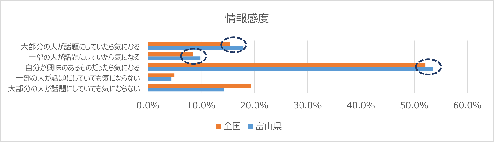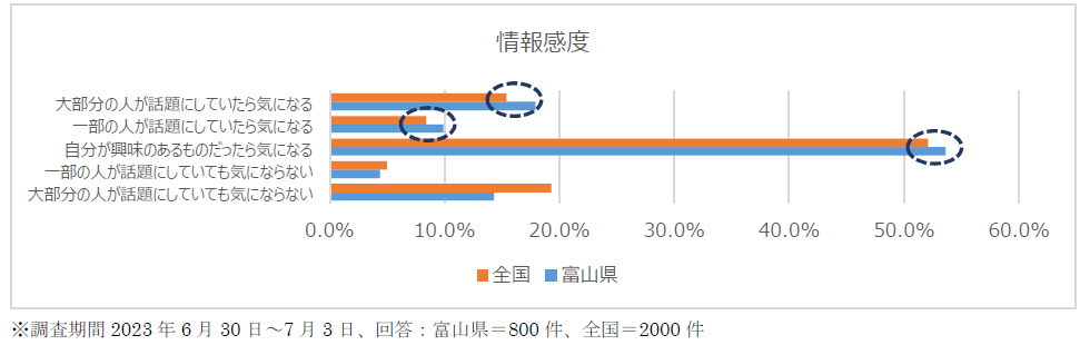 3社は協議テーマの設定に向けて、調査やヒアリングも行っております。6月末に富山県内800人、全国2,000人から回答を得たインターネットのアンケート調査では、富山に暮らす人は、全国に比べて情報感度が高く、旅行や外食、健康、貯金に関心が強い傾向が見て取れました。こうしたデータも基にしながら、実効性の高い取り組みを研究してまいります。