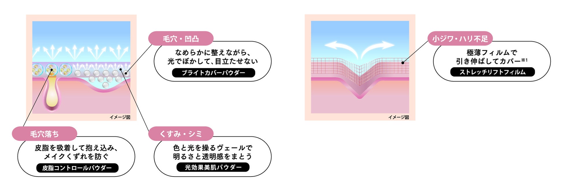 また、3種類のパウダーに加えて「ストレッチリフトフィルム」を採用。フィルム状のリフトアップ成分が凹凸部分を縦横に引き伸ばし、肌表面をなめらかにすることで、ピンとしたハリ感のある肌印象を叶えます。