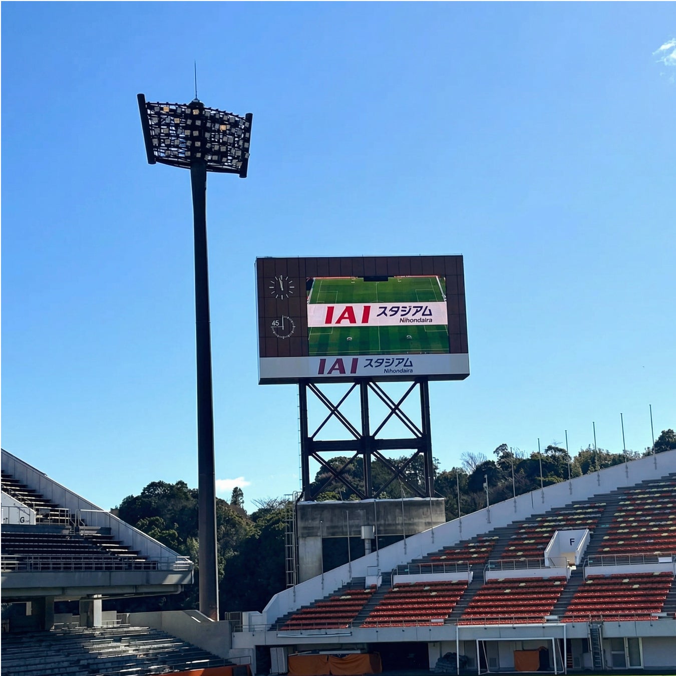 2007年3月には、メインスタンド側に大型映像装置「アストロビジョン」を新設。映像表現の幅は大きく広がりましたが、電力確保の制約により、西サイドスタンドの電光掲示板は役目を終え、以降はネーミングライツパートナーである株式会社アイエイアイのロゴ看板として、長年スタジアムを見守ってきました。