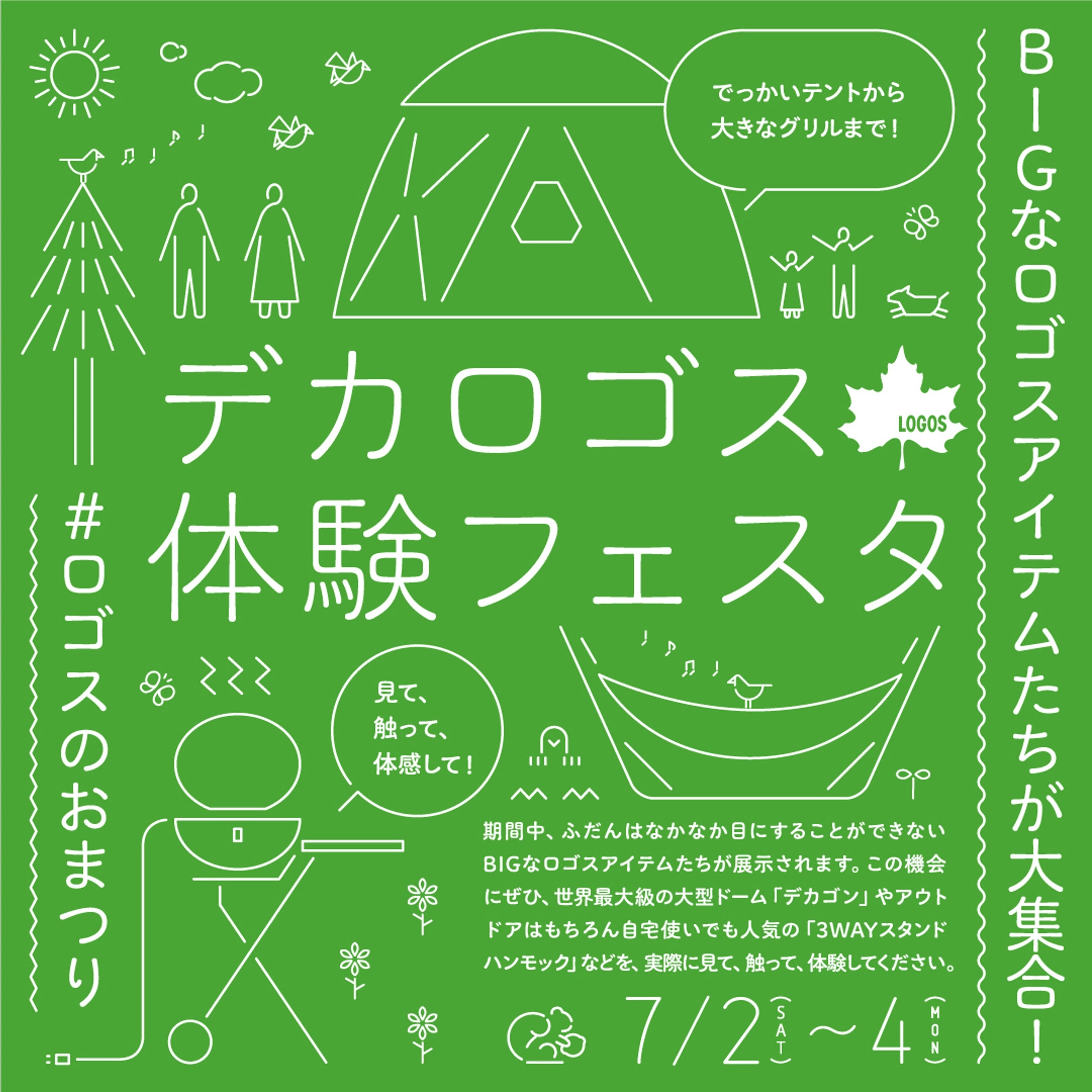 大型テントをはじめとする様々なアイテムを見て、触れて、体験できるロゴスのおまつり「デカロゴス体験フェスタ」へ、ぜひお気軽にお越しください。