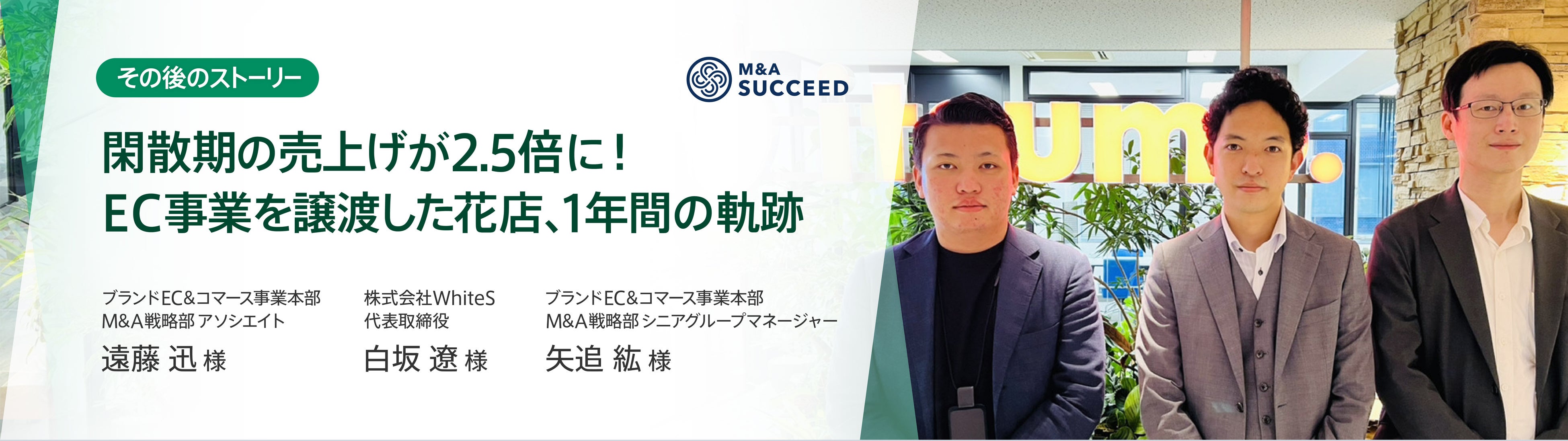 Visionalグループの株式会社M&Aサクシード(所在地:東京都渋谷区/代表取締役社長:金 蓮実)が運営する法人・審査制M&Aマッチングサイト「M&Aサクシード」(https://ma-succeed.jp/)を通じて、ECの総合支援事業を運営する株式会社いつも(所在地:東京都、以下「いつも」)は、2021年8月に、生花販売を手掛ける株式会社WhiteS(ホワイツ)(所在地:香川県、以下WhiteS)のEC事業を譲り受けました。EC事業のM&A後1年で、WhiteSの閑散期である2022年6~8月の売上高が前年比約2.5倍に増加しました。そこで、このたび、その後の状況と今後について二社の対談を公開しました。