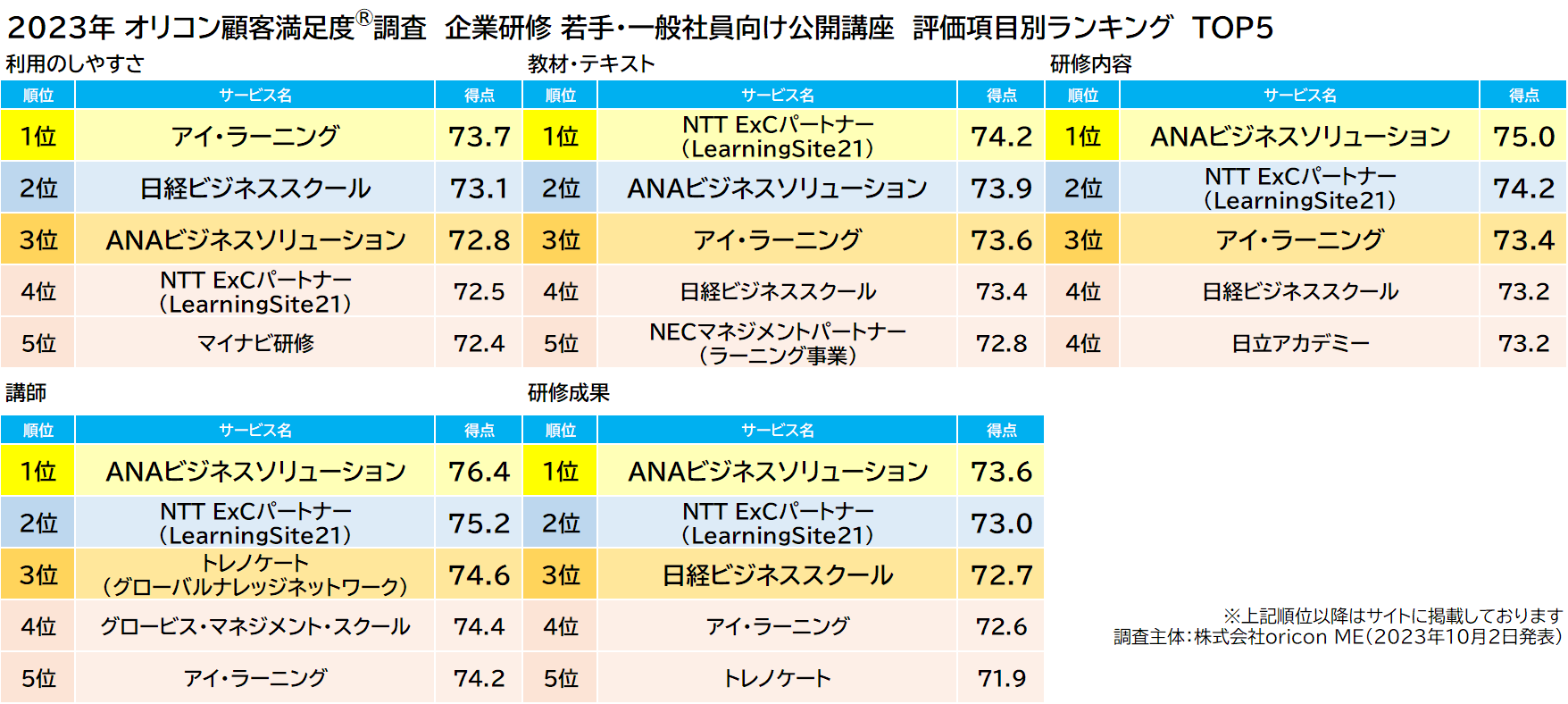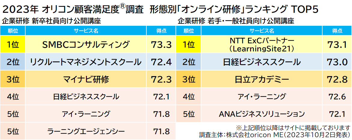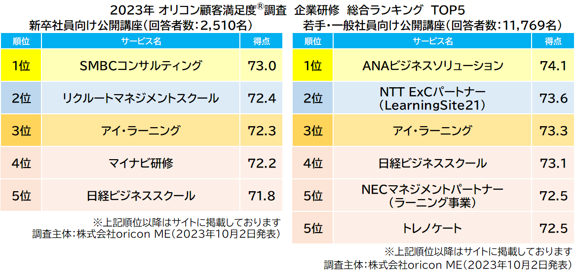 2023年 満足度の高い『企業研修』ランキング発表|新卒向けは【SMBCコンサルティング】、若手・一般向けは【ANAビジネスソリューション】が総合1位、「オンライン研修」も発表(オリコン顧客満足度)