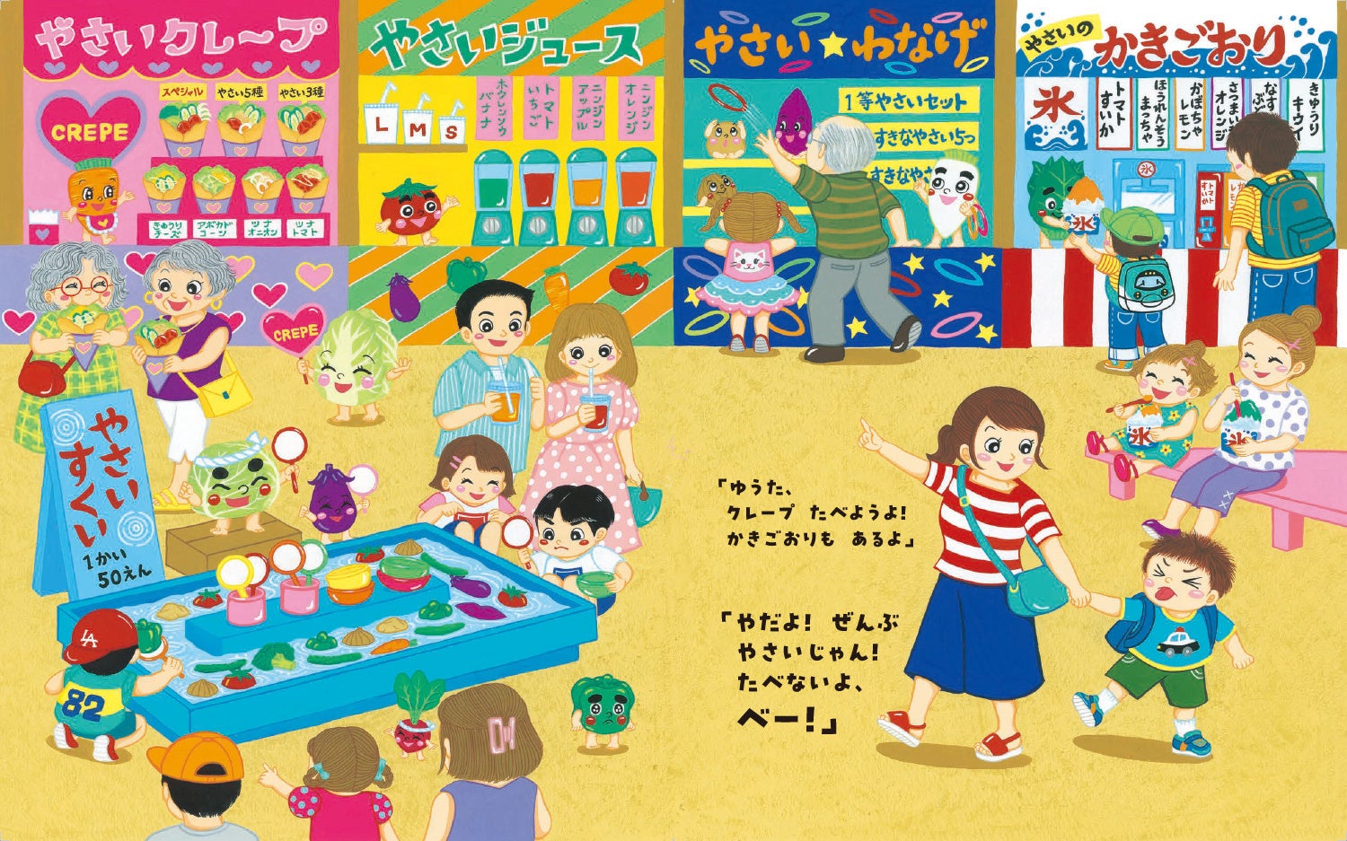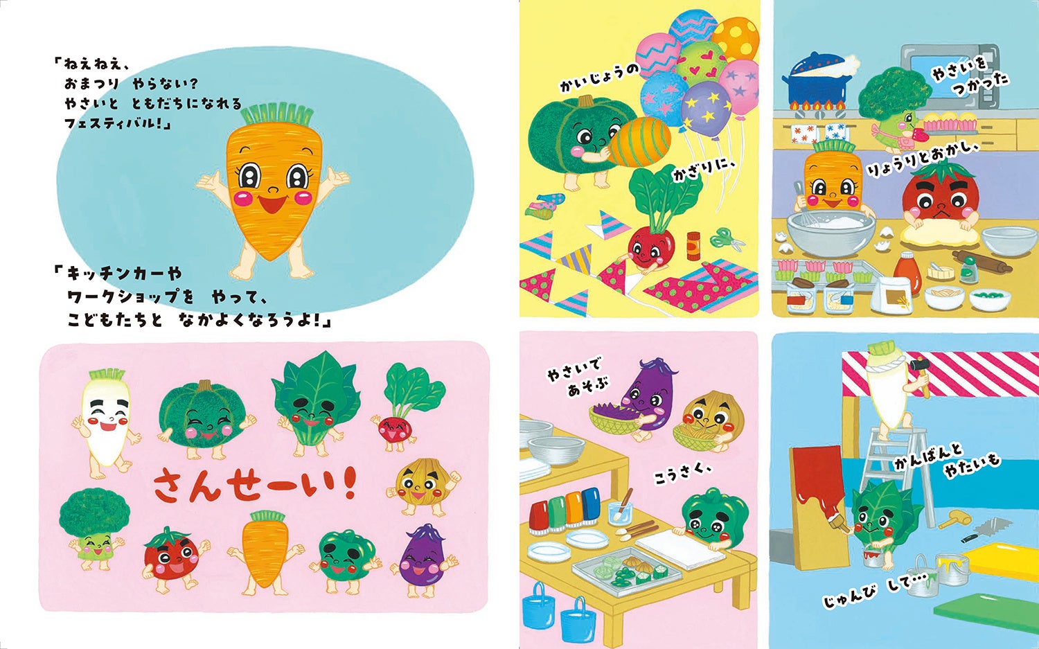 最新刊の絵本では、いろいろな野菜たちが登場し、フェスティバルを開催して、野菜ぎらいのゆうた君と友だちになろうとがんばります。
