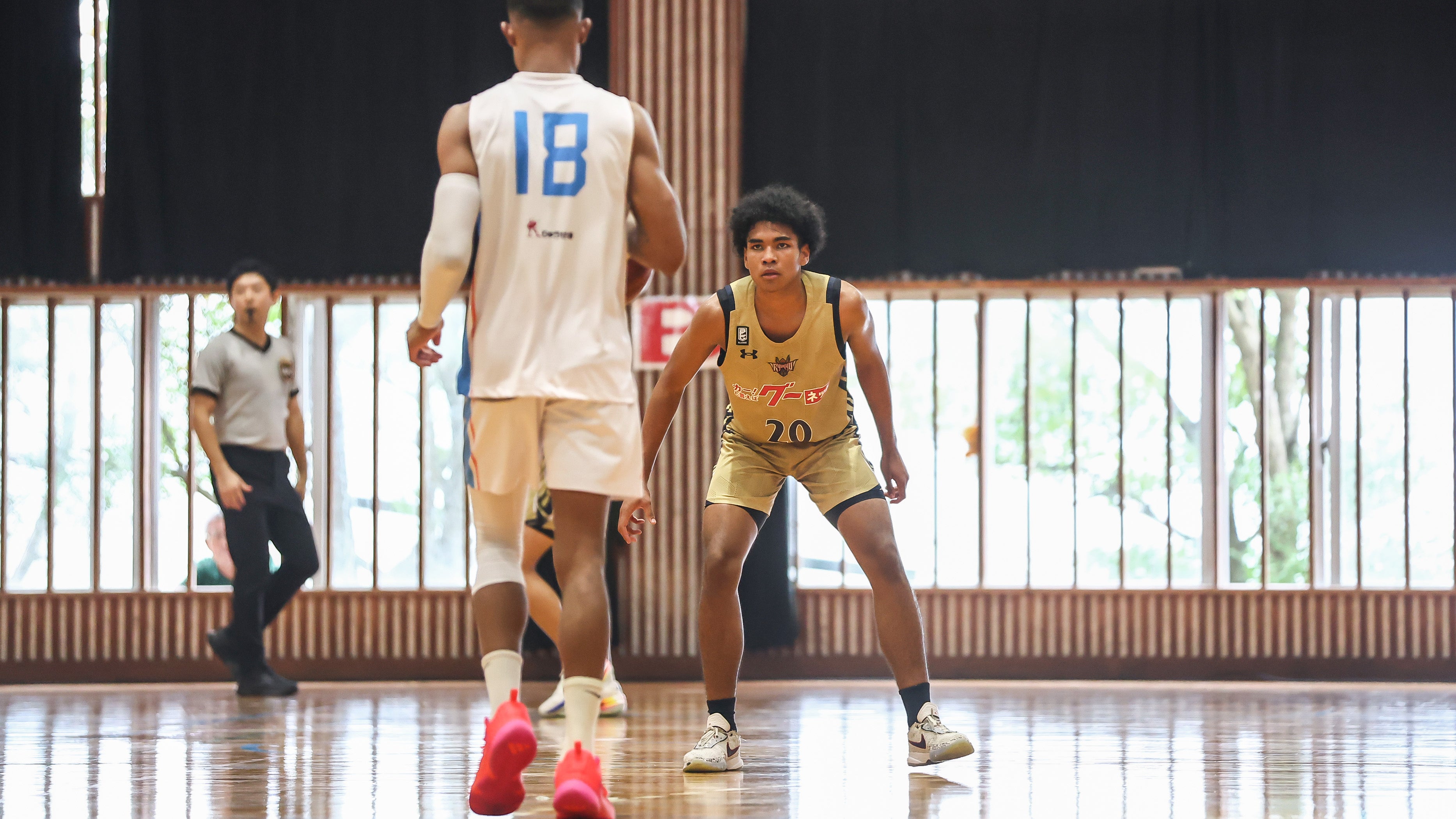 天皇杯 沖縄県代表決定戦にユースクラブチームとして初出場したキングスU18は、#25 上原颯太選手がレイアップで得点すると、#77 佐取龍之介選手がゴール下で加点。さらに#1 宜保隼弥選手が3Pシュートを沈めると、#77 佐取選手が冷静にゴール下で得点を重ね、18-17で1クォーターを終了します。