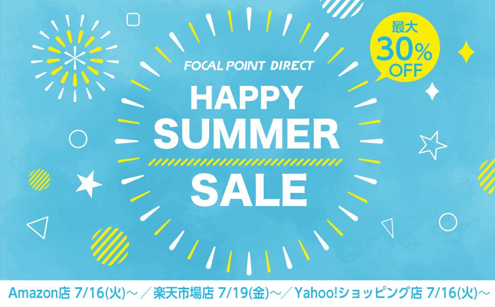 フォーカルポイント株式会社(本社:神奈川県横浜市、代表取締役 恩田英樹 以下フォーカルポイント)は、直営オンラインショップ フォーカルポイント・ダイレクトAmazon店、楽天市場店にて最大30%OFFのHAPPY SUMMER SALEを開催いたします。また、セール期間が各ショップによって異なりますので、ご注意ください。各ショップのセール開催期間は、以下の通りになります。Amazon店は、一部の商品の期間が異なります。また、楽天市場店、Yahoo!ショッピング店は、商品がクーポンセールになります。