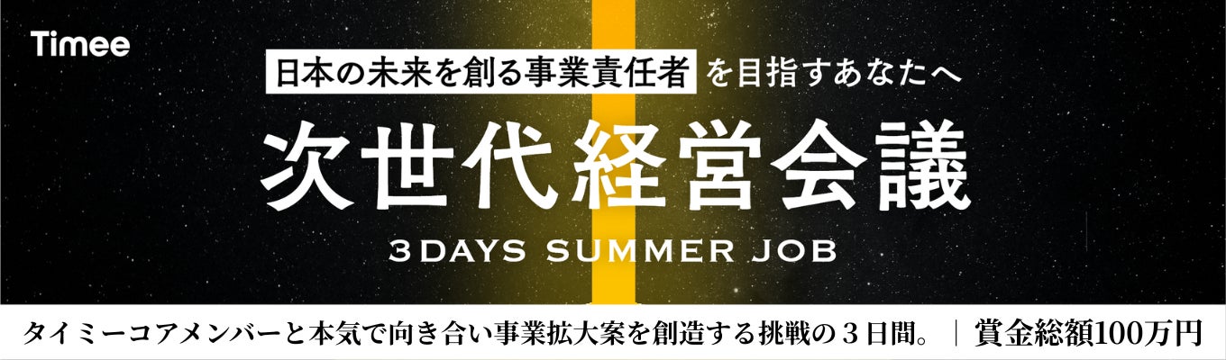 スキマバイトサービス「タイミー」を提供する株式会社タイミー(本社:東京都港区、代表取締役:小川 嶺)は、2026年7月3日(金)〜5日(日)に2028年度卒業予定の学生を対象に、全国選抜型の3days Jobプログラム「次世代経営会議」を開催します。
