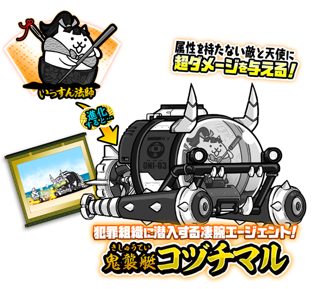 進化すると、烈波ダメージを無効化し、全方位への範囲攻撃で属性を持たない敵と天使に超ダメージを与える「鬼襲艇コヅチマル」に変身!