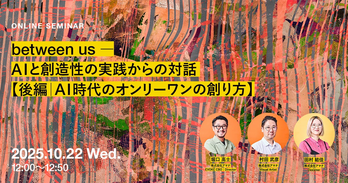 コミュニケーション変革をクリエイティブで実現する株式会社アマナ(本社:東京都品川区、代表取締役社長:金子剛章、以下「アマナ」)は、2025年10月22日(水)、「between us ― AIと創造性の実践からの対話【後編|AI時代のオンリーワンの創り方】」をテーマにウェビナーを開催します。