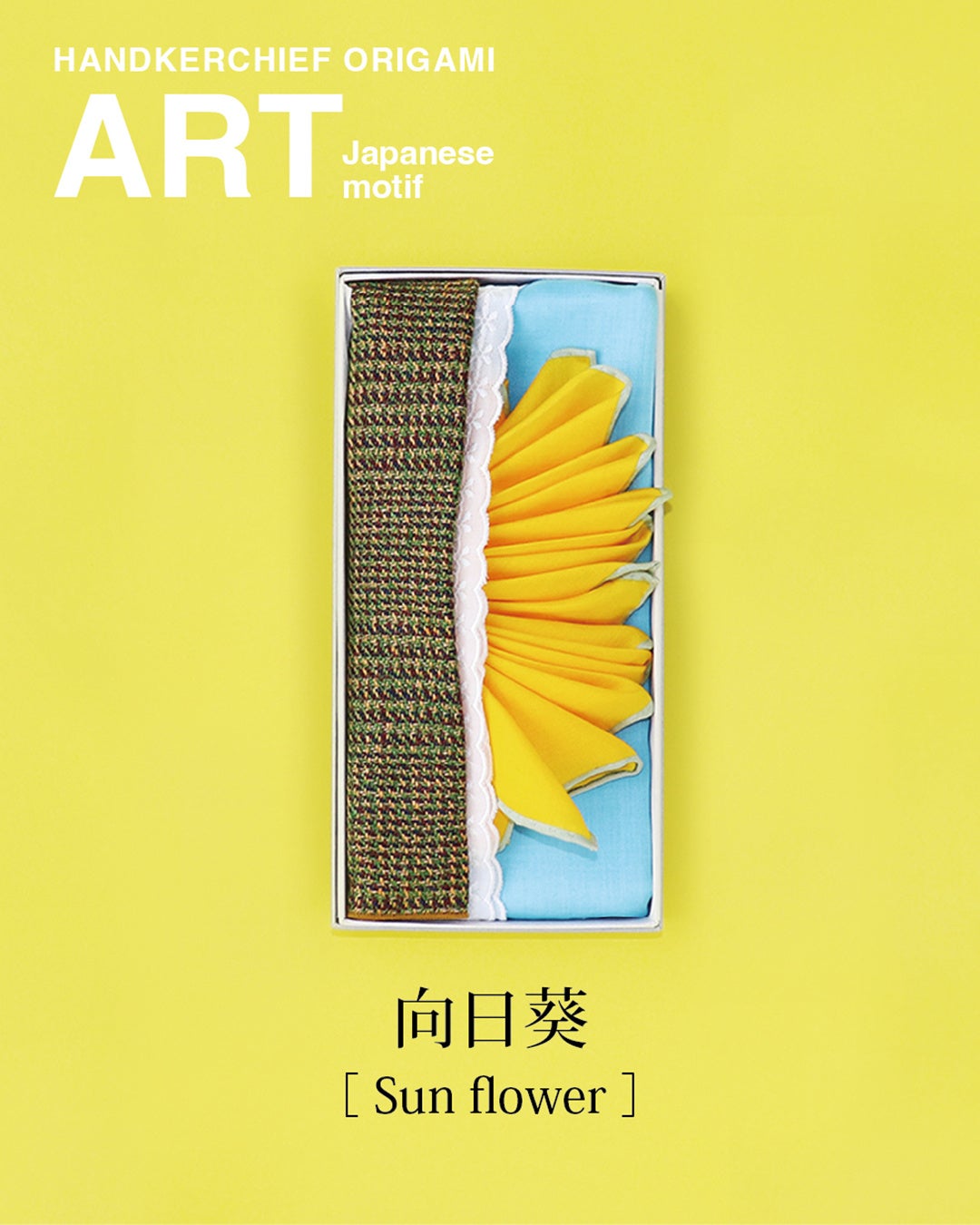 太陽に向かって咲く向日葵は、真夏のエネルギーそのもの。ヘンプチェックのハンカチを花芯に見立て、花びらの鮮やかなイエロー、澄んだ青空と白い雲を思わせる4枚のハンカチを折り重ねて表現しました。