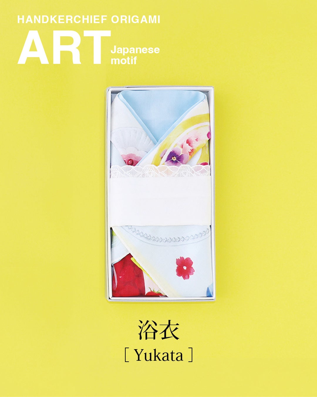 木綿の浴衣地で作られた単衣(ひとえ)の着物は、夏祭りや盆踊りなど、夏のイベントで着用されます。3枚のハンカチを折り重ねることで、夏の伝統衣装を表現しました。