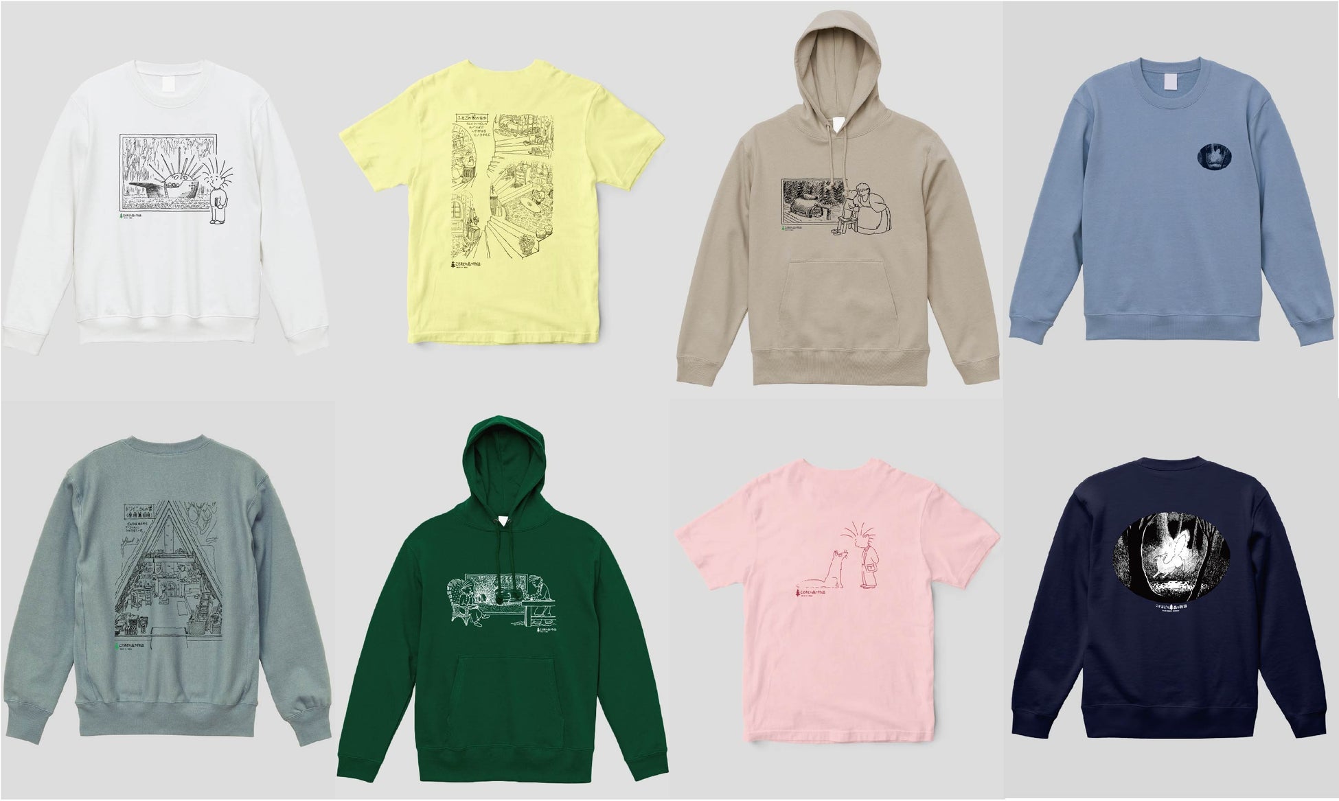 会場には「こそあどの森」での思い出に、登場人物がプリントされた、Tシャツやトレーナー、ミニトートがならぶ、お買いものコーナーもあります。アパレルのアイテムは、スキッパーが住む家「ウニマル」がプリントされたとくべつなオーダーカードでご注文いただく、受注販売方式です。