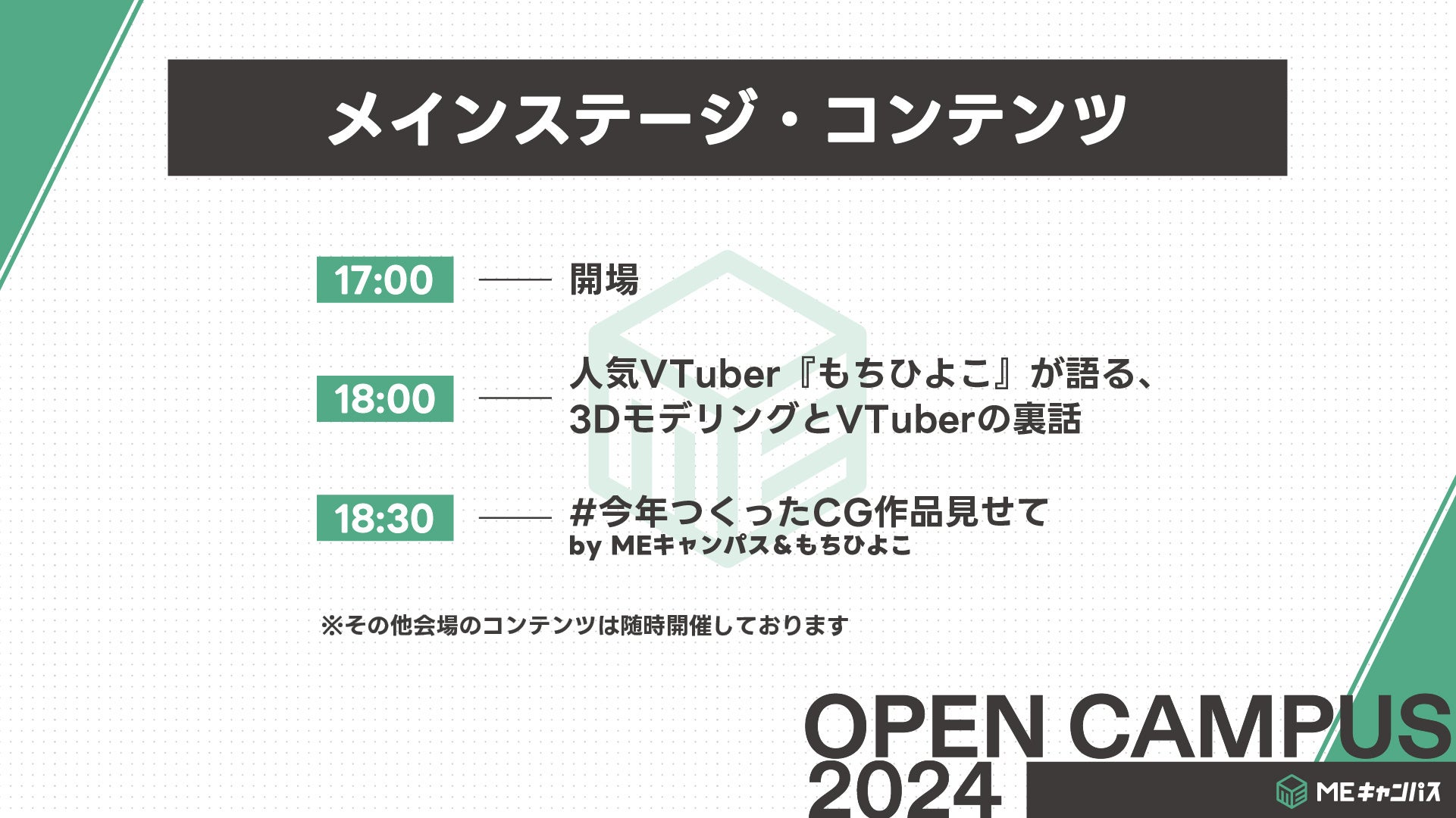 ハッシュタグ「#今年つくったCG作品見せて」でXに投稿された作品の中から、優秀な作品を選出し、人気VTuber「もちひよこ」とMEキャンパスの専門家が多角的な視点で紹介・解説します。また、もちひよこがコメンテーターとして登場し、CG制作の魅力やポイントを深掘りします。