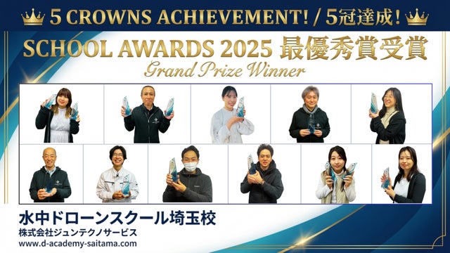 水中ドローンスクール埼玉校(株式会社ジュンテクノサービス)は、この度、全国アワードにて最優秀賞を受賞いたしました。2021年以来の受賞となり、スタッフ一同大きな励みとしております。当校は、水中ドローンを地域社会の安心・安全を支える実務ツールとして活用推進し、人材育成とセットで導入提案を実施しております。今後も導入相談から業務支援、修理・レンタル・リース含めた総合支援体制を強化してまいります。