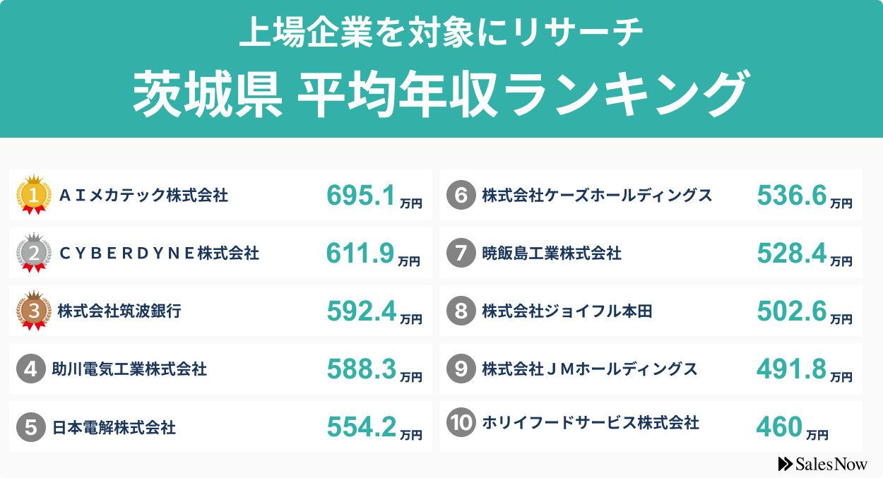 【茨城県】上場企業平均年収ランキングTOP10!/SalesNow DBレポート