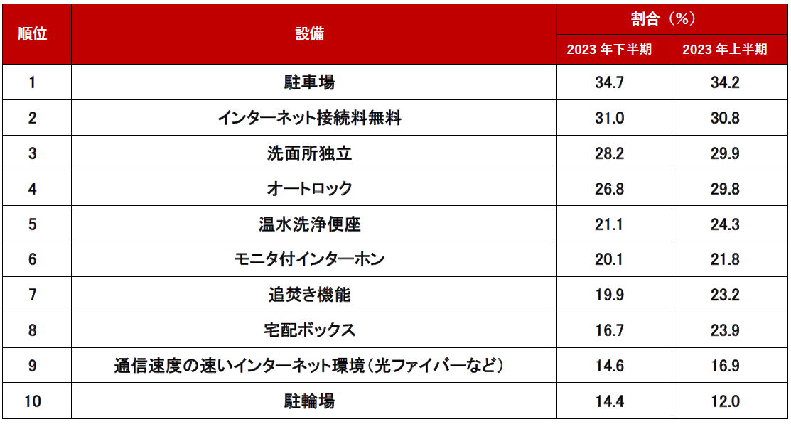 設備編の1位は「駐車場」で、2023年上半期から+0.5ポイントとなりました。不動産会社からは、「電気自動車のため駐車場に充電器もしくはコンセントが欲しい、と言われることが多くなった」というコメントも見られ、電気自動車を所有している人からの問合せも増えているようです。