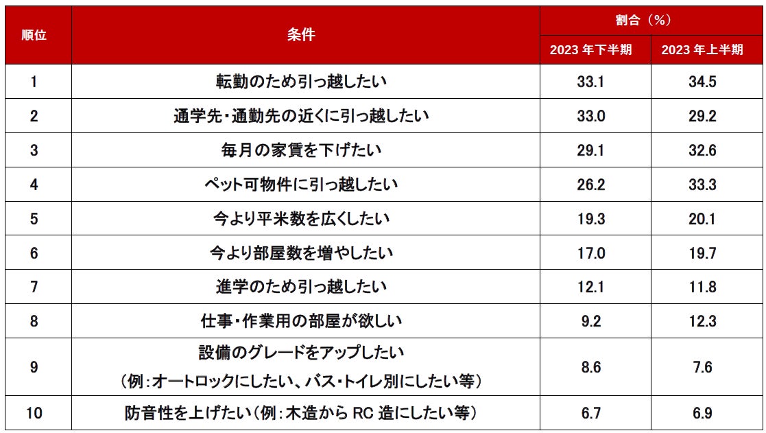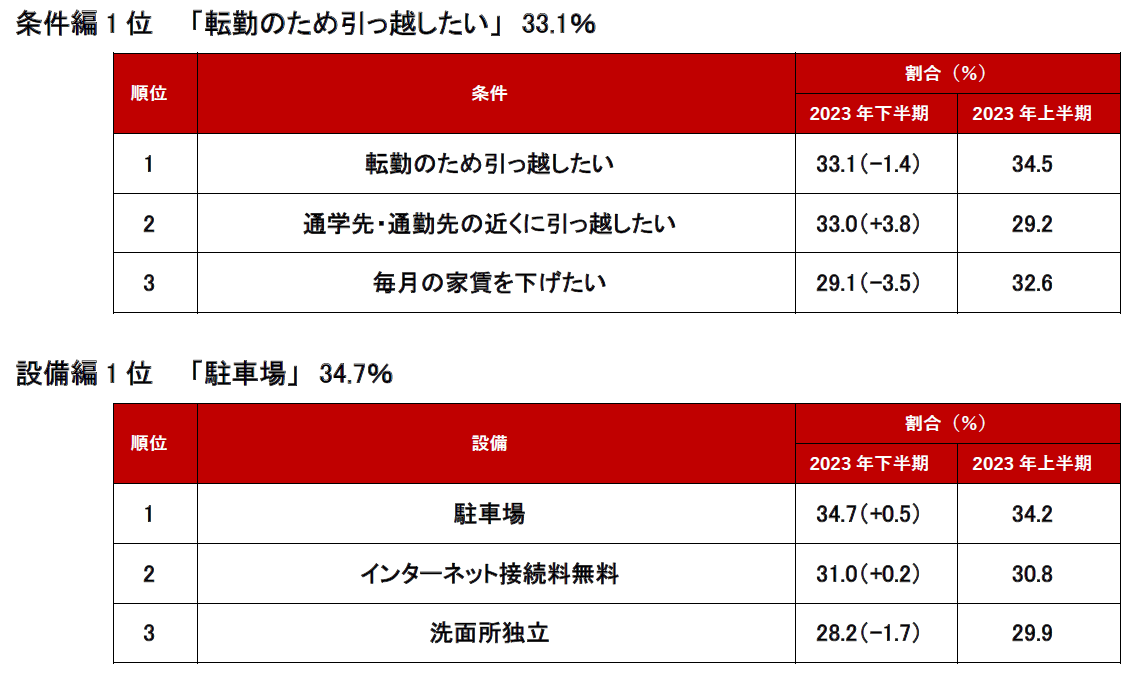 2023年上半期に引き続き、条件編1位「転勤のため引っ越したい」・設備編1位「駐車場」