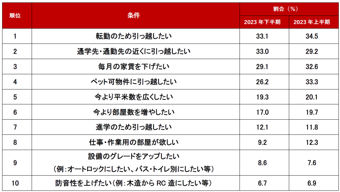 不動産のプロである不動産会社の方に、2023年下半期に問合せが多かった条件を聞いたところ、「転勤のため引っ越したい」が2023年上半期に引き続き1位となり、不動産会社のコメントでは「転勤に伴う住まい探しが多かった」というコメントが上がりました。「毎月の家賃を下げたい」と「通学先・通勤先の近くに引っ越したい」がそれぞれ上半期・下半期でトップだった2022年と比べ、2023年は“転勤”をきっかけに住まいを探す人が多かったようです。