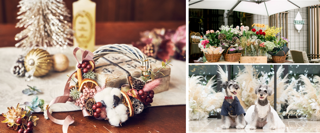 ウェディングの装花をアップサイクルしたドライフラワーや、アンティーク小物、ウェディングドレス生地を使用した愛犬用ドレスなど