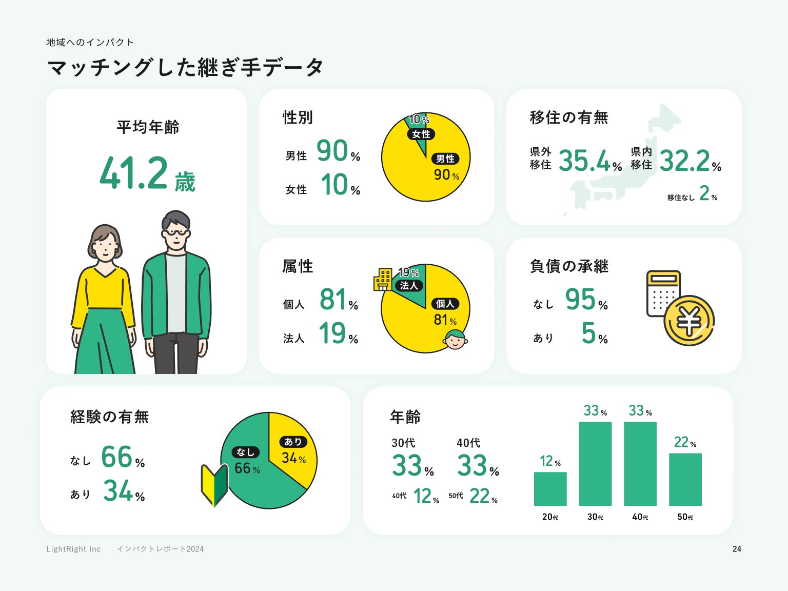 ライトライトが2024年5月に発行した「relay インパクトレポート 2024」内に掲載の「relayでマッチングした継ぎ手データ」によりますと、relayで第三者承継マッチングをした継ぎ手の平均年齢は41.2歳、属性は個人が81%、そして継ぎ手の67.6%が県内外を含めた移住をしていることがわかります。