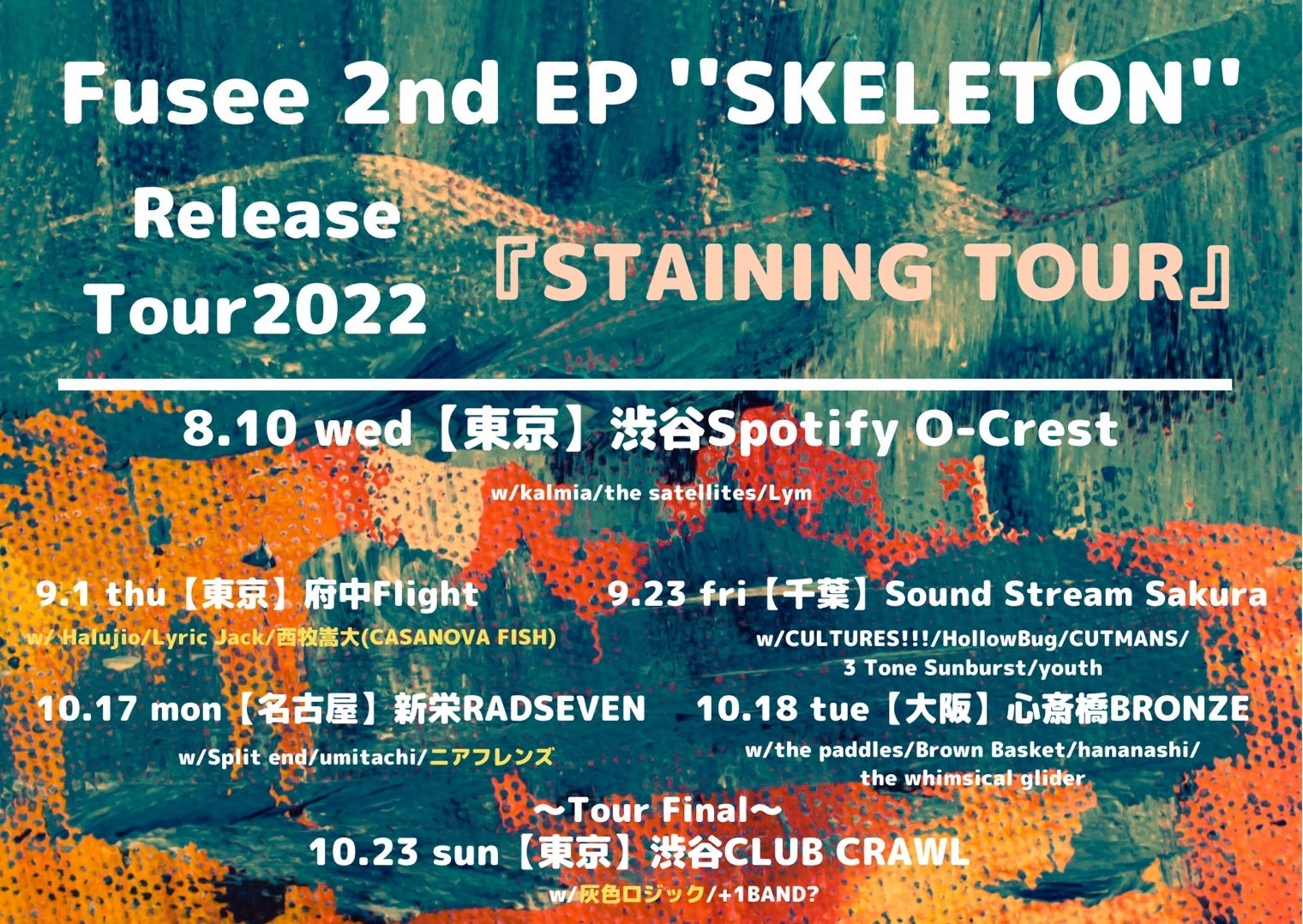 また、本日開催されたSpotify O-Crest公演を皮切りに、東名阪全6会場をまわるリリースツアー『STAINING Tour』のファイナル公演が、10月23日(日)に東京・渋谷CLUB CRAWLにて開催されることが発表された。Fuseeメンバーが敬愛している、灰色ロジックをはじめとするスリーマンライブを予定している。日本のロック史に刻まれる新たな名曲たちの誕生と、Fuseeのバンドとしての新たな第一歩を、ぜひ見逃さずにチェックしてほしい。