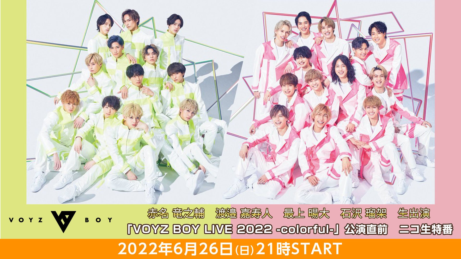 現在24名規模で活動する次世代ボーイズグループ、VOYZ BOY。7月10日(日)開催の「VOYZ BOY LIVE 2022 -colorful-」公演に向けたニコ生特番が6月26日(日)21時から、メンバーの赤名竜之輔 、渡邉嘉寿人、最上暘大、石沢瑠架、生出演で決定した。