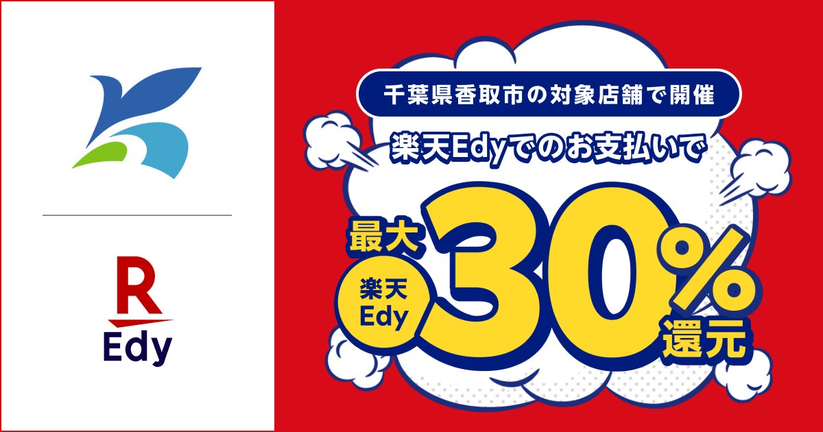 楽天ペイメント株式会社(以下「楽天ペイメント」)と楽天Edy株式会社(以下「楽天Edy」)は、楽天Edyが運営するIC型電子マネー「楽天Edy」において、千葉県香取市が2024年2月1日(木)から2月29日(木)まで実施する「香取市deキャッシュレス!対象キャッシュレス決済で最大30%が戻ってくる!!キャンペーン」に参加することをお知らせします。