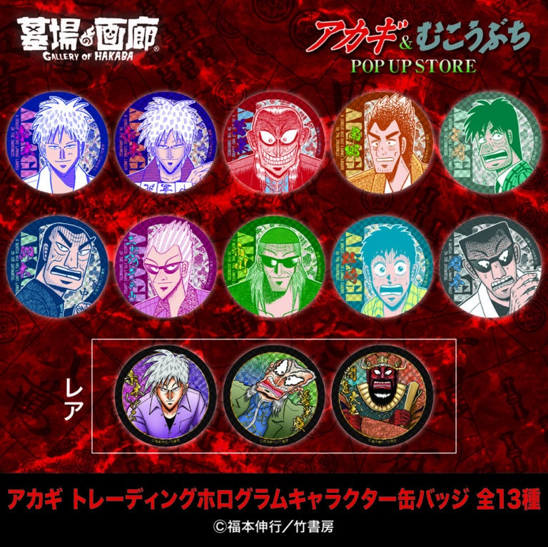 アカギ トレーディングホログラムキャラクター缶バッジ(全13種ホロ) 各500円(税込)