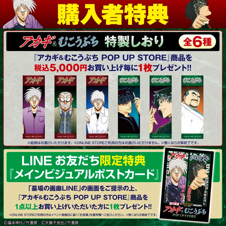 ※LINEお友だち登録をしている方を対象にイベント開催期間中、店頭またはONLINE STOREで『アカギ』&『むこうぶち』POP UP STOREグッズを1点以上のご購入で1枚プレゼントいたします。(無くなり次第終了)