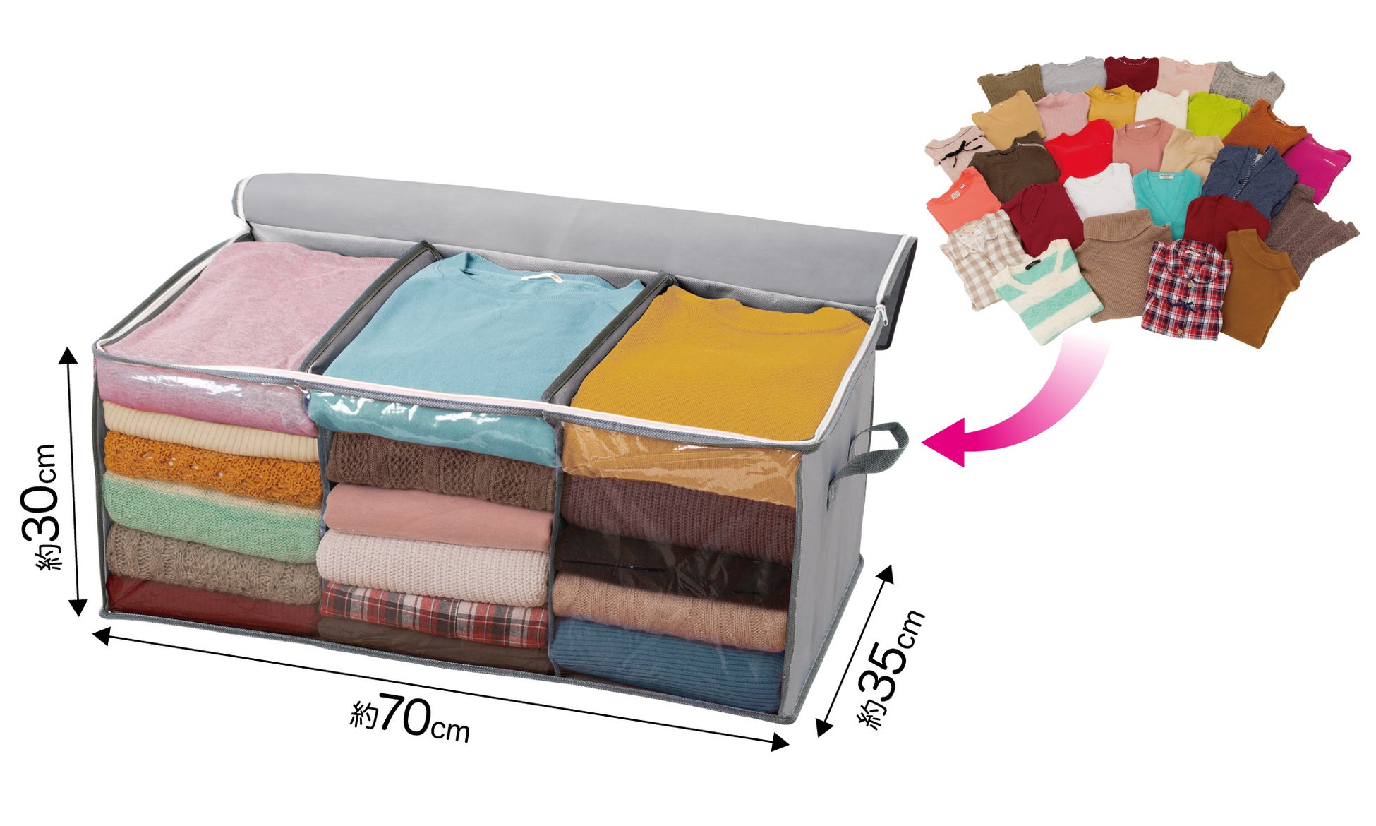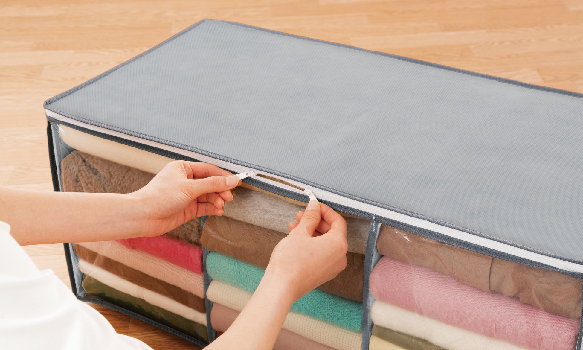 間仕切りが付いており、たっぷりの収納力で分類して整理整頓ができるので、衣替えも楽々スッキリ。