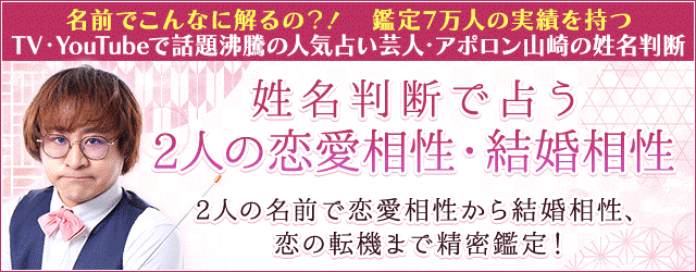 圧倒的な的中力を誇る占い芸人「アポロン山崎」の本格姓名判断サイトにて、この度『姓名判断で占う2人の恋愛相性・結婚相性』を無料公開いたしました。この占いではあなたやあの人の名前の画数から、お互いの恋愛相性・結婚相性がわかります。また今後2人の関係が進む運命の日や、先々の恋の展開まで詳細に占うこともできます。芸能界絶賛の的中力・成就力を誇る鑑定をぜひご体感ください。