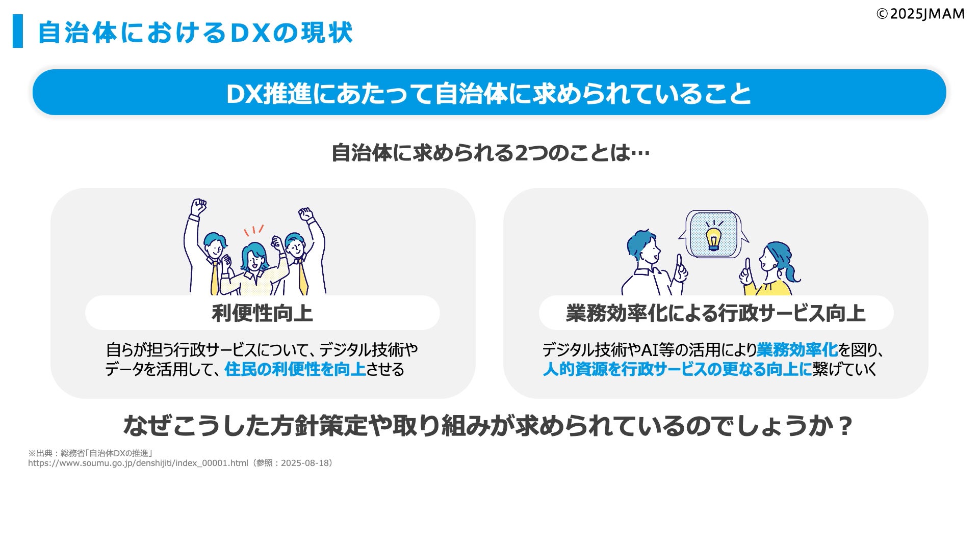 そこでJMAMは、自治体領域特有の政策動向・技術・成功事例を短時間で把握できる『押さえておきたいDXトレンド 自治体編』を開発しました。本コースでは、自治体におけるDXの現状や課題、先進事例、DXを支える技術の全体像を短時間で把握できるよう構成しており、具体的な事例を通じて「自組織のどの課題に、どのようなDXの取り組みを適用できるのか」を検討する土台づくりを支援します。