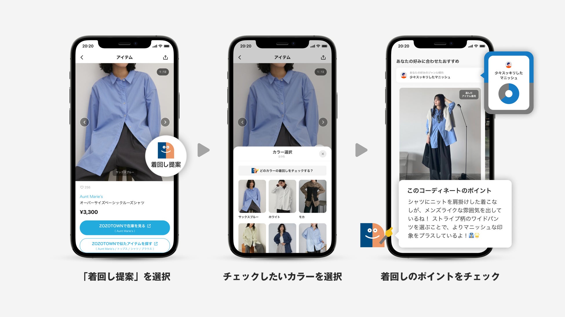 アプリ初回起動時にファッションジャンル診断画面が表示され、ユーザーは好みのスタイルを5枚以上選択します。その結果をもとに、AIがユーザーの好みを数値化した「ジャンル」を表示します。その後、コーディネート画面から特定のアイテムとカラーを選択すると、AIがユーザーの好みのジャンルに合わせて、そのアイテムを活用した着回しをコーディネート画像とテキストで紹介します。さらに「体型の悩み」を登録することで、ユーザーの悩みを解消するコーディネートを提案します。