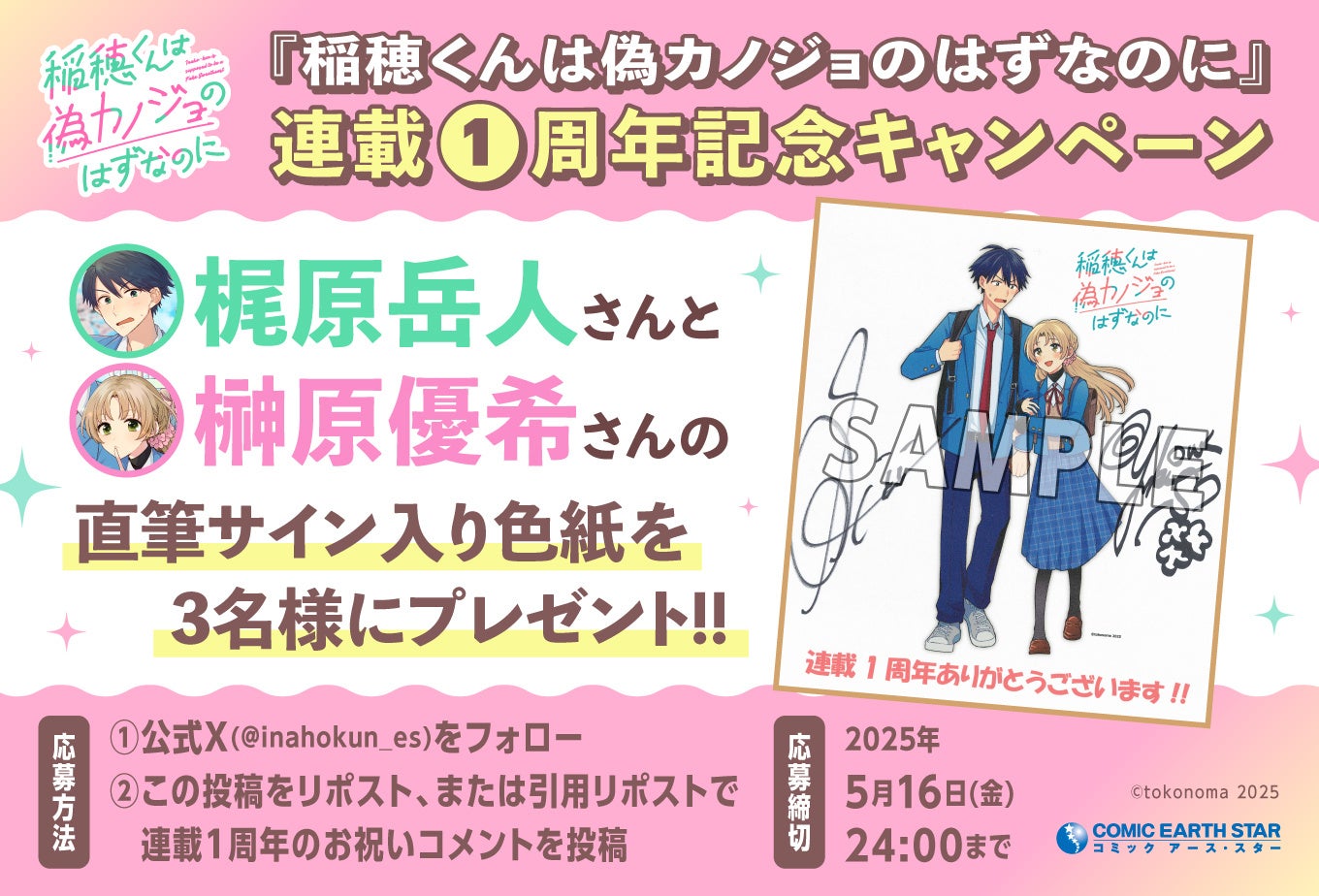 『稲穂くんは偽カノジョのはずなのに』公式Xアカウントのキャンペーン投稿をリポストまたは引用リポストで連載1周年のお祝いコメントを投稿した方の中から、3名様に梶原岳人さんと榊原優希さんの直筆サイン入り色紙をプレゼント。