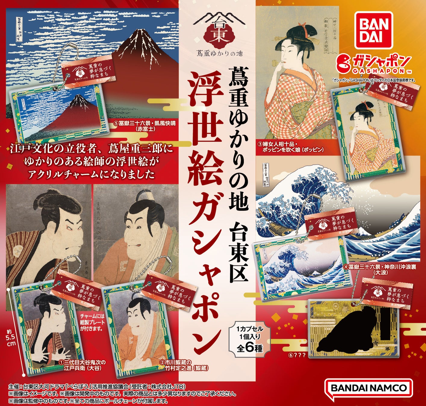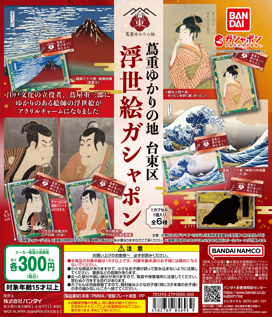 株式会社バンダイ ベンダー事業部(本社:東京都台東区)は、「蔦重ゆかりの地 台東区 浮世絵ガシャポン」(1回300円・税10%込、全6種)を2025年2月第1週より、台東区内の14ヵ所に設置されたガシャポン自販機シリーズにて発売いたしました。これは、2025年放送の大河ドラマ「べらぼう~蔦重栄華乃夢噺~」を機に、舞台となる台東区の歴史・文化の魅力の発信や地域の活性化を図るために設立された“台東区大河ドラマ「べらぼう」活用推進協議会”の取組の一環として行われるものです。