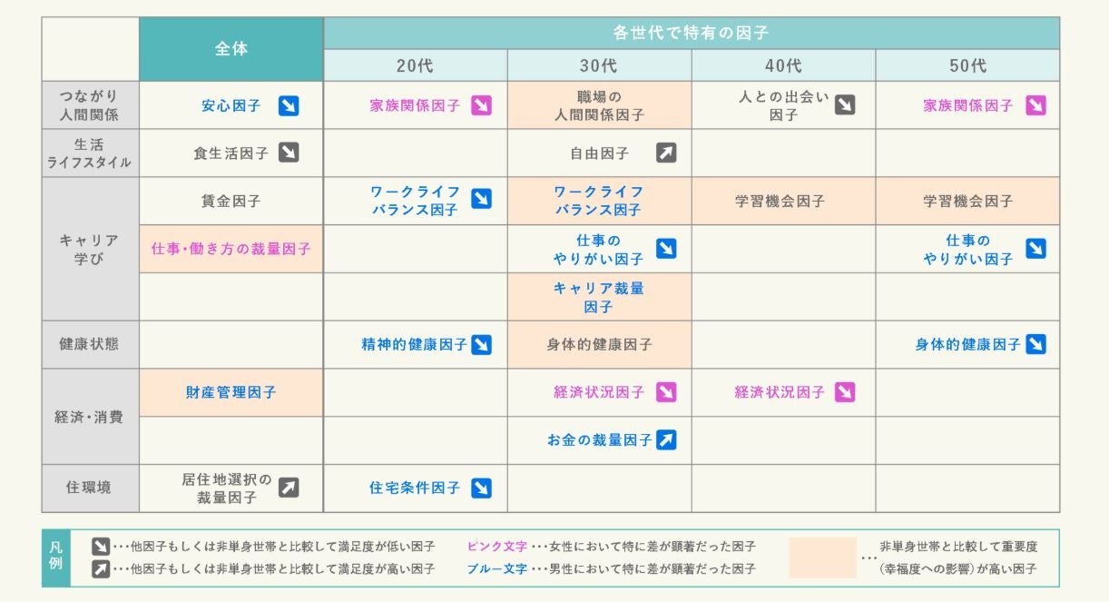 尚、日鉄興和不動産が運営するライフデザイン総研のプロジェクト「+ONE LIFE LAB(プラスワンライフラボ)」は、2024年に「単身世帯の幸福度に影響を与える因子調査」を実施しており、(https://www.nskre.co.jp/company/news/2024/20241212.html)「身体的健康」は、幸福度との相関が高いことを確認しております。
