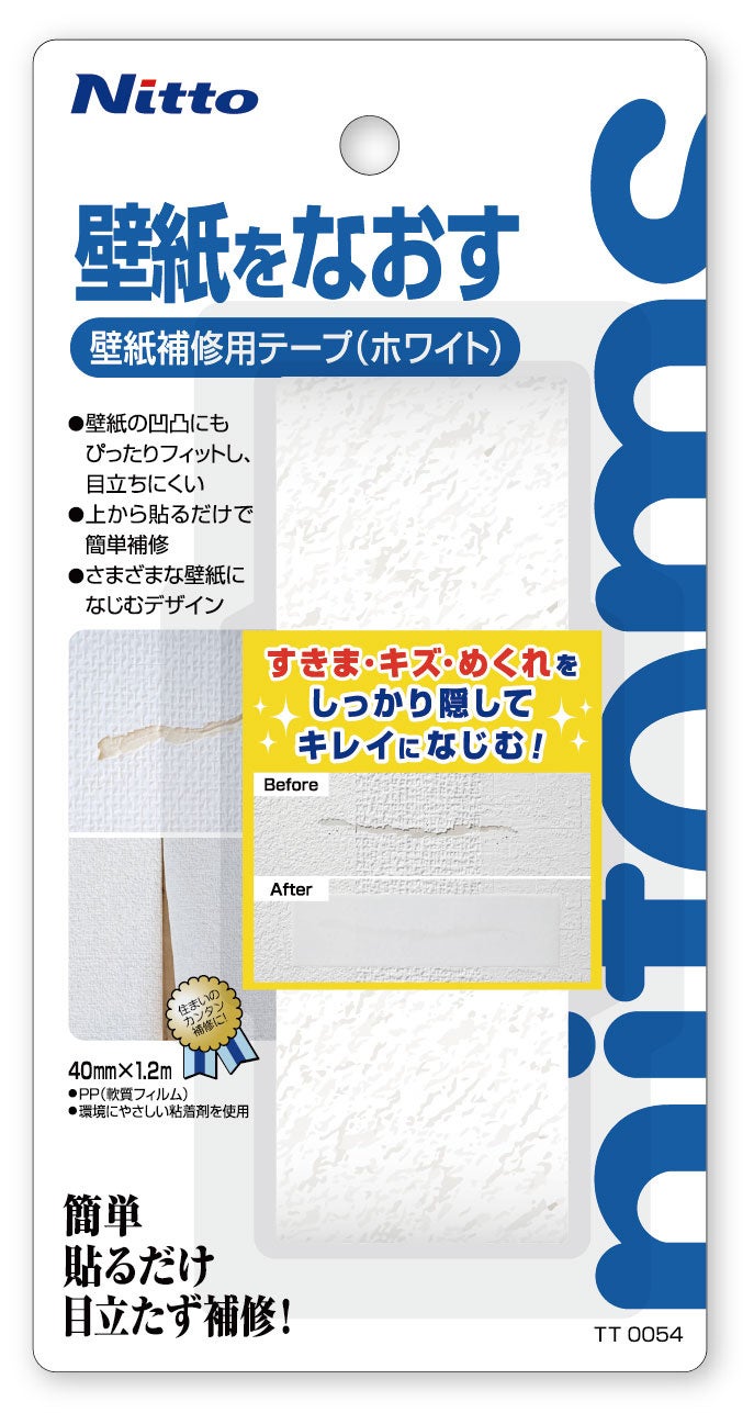 壁紙にできた小さなキズや破れ、すきま、はがれなど、さまざまな悩みを“貼るだけ”で手軽に解決できる壁紙補修用のテープです。当社が実施したアンケートでは、壁紙で補修したい箇所として、1~2cm程度のキズや破れ、すきま、はがれなどが特に多く挙げられていることがわかりました。様々な状況に柔軟に対応するため、開発した本製品は、広幅テープ仕様により、一般的な小さめのシールタイプの補修材では対応が難しかった縦長の傷みや大きめのキズ、すきまを簡単に補修することが可能になりました。また、しっかりと密着することで、壁紙の浮きやはがれも抑えることもできます。壁紙の凹凸にしっかりと追従する柔らかく薄手の基材を採用し、表面には、様々な色・柄になじむモザイク印刷を施しているので、補修後も違和感のない自然な仕上がりを実現します。ホワイト系の壁紙にあわせやすいホワイトとベージュ系の壁紙に調和するベージュの2色展開です。