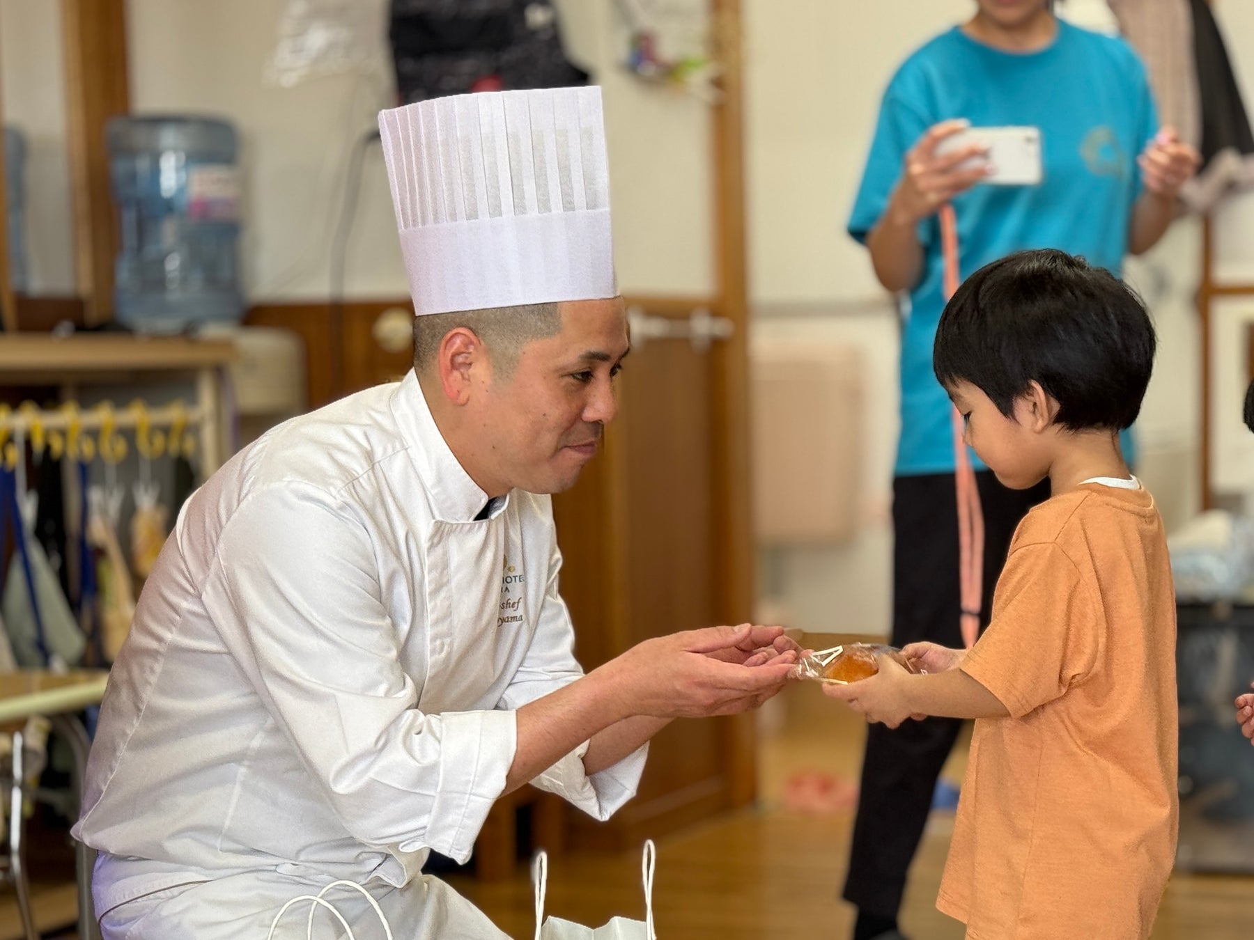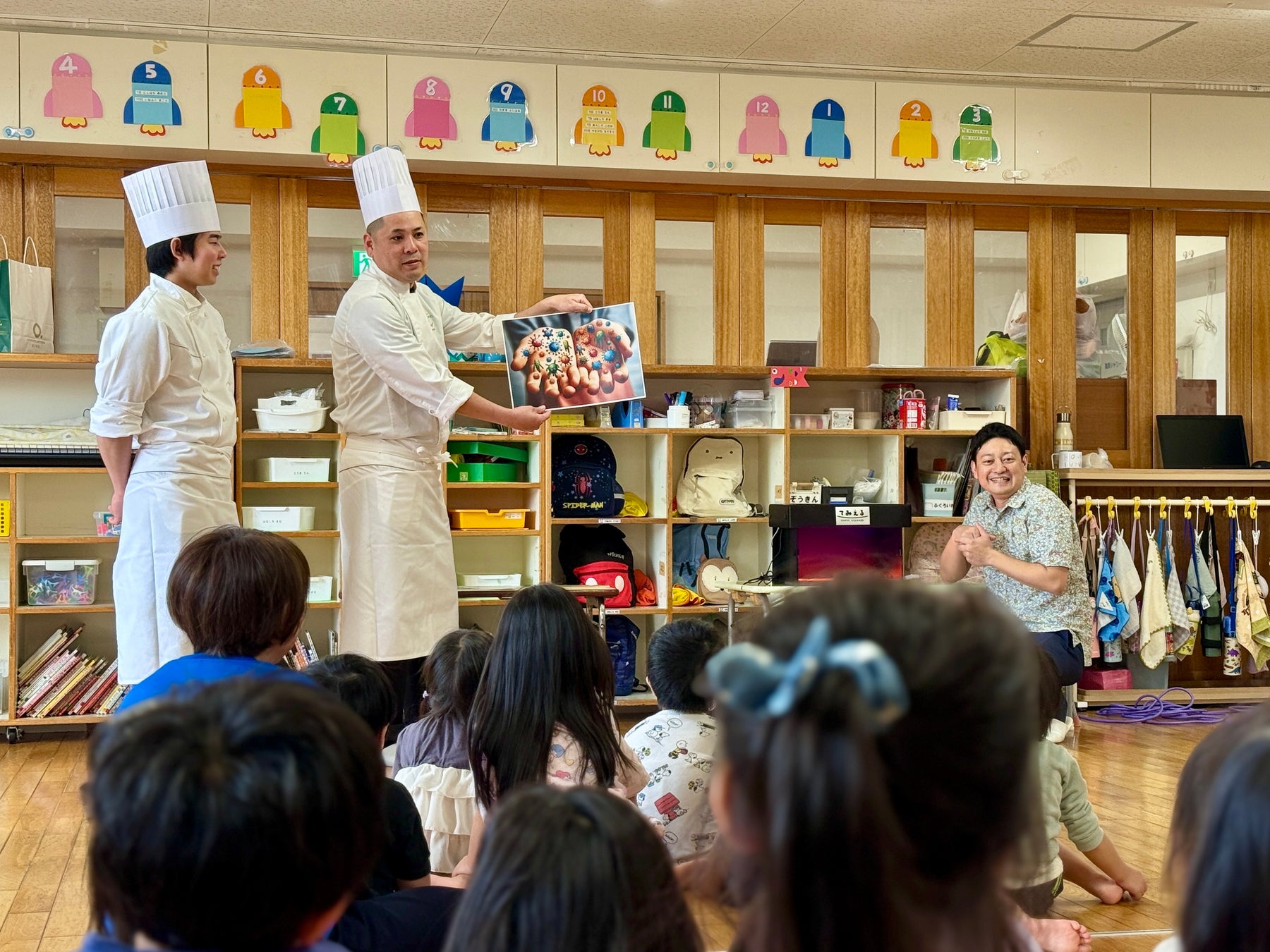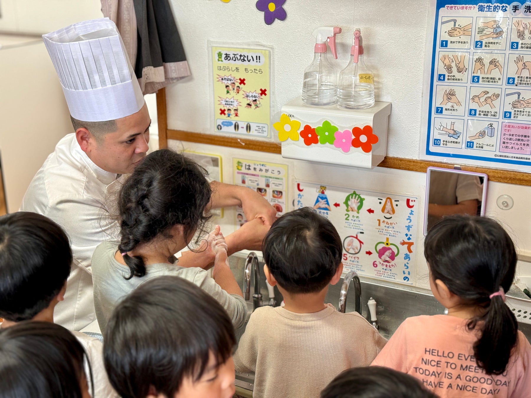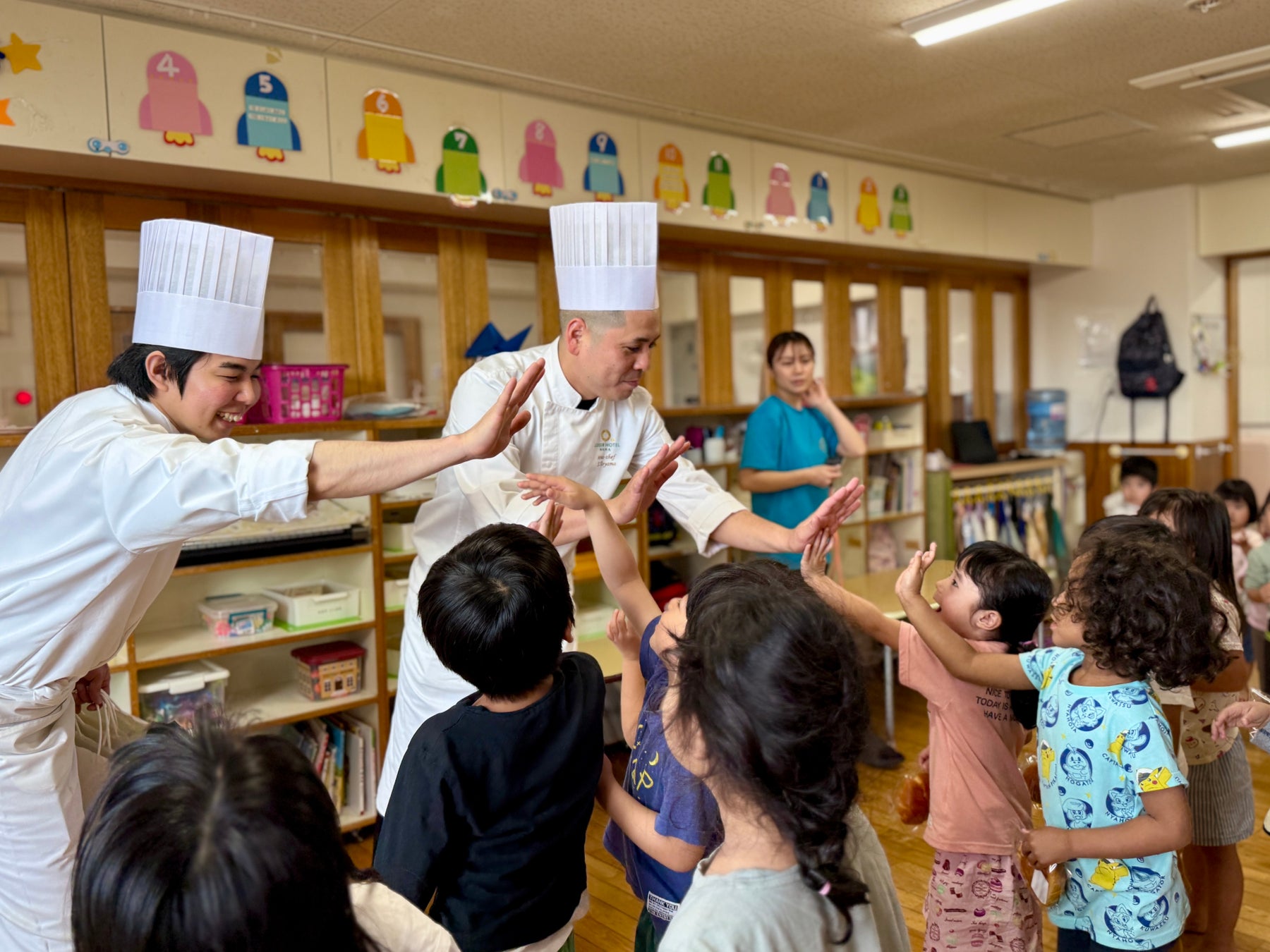 今回のJFS規格適合証明の取得に伴い、地域貢献活動の一環として「キッズ手洗いプログラム」を開催。2025年4月8日(火)、県内にある報徳保育園(所在地:沖縄県那覇市、園長:立津 笑佳)へ出向き、ホテルシェフが児童たちに手洗い講習を行い実践後にはホテルメイドのクリームパンを贈呈。楽しみながら学ぶことができたこの講習は、園児たちや教員から大変好評をいただきました。