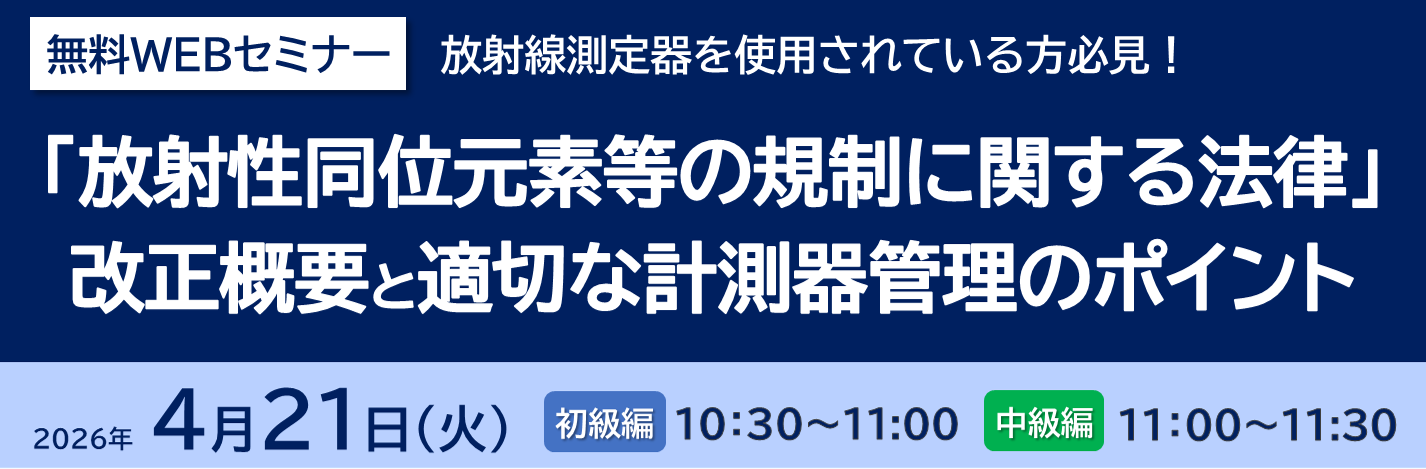 本セミナーでは、放射線測定器および校正の基礎知識をはじめ、RI法の改正概要や同法に対応した適切な計測器管理のポイントなどについて、初級・中級の2部制で分かりやすくご説明いたします。