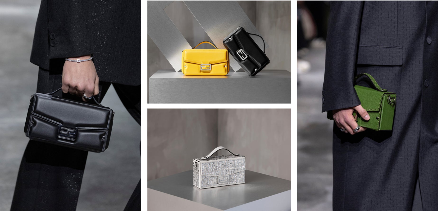 2024-25年秋冬 メンズコレクションからは、多彩な「バゲット ソフト トランク」が新たにラインナップしました。グリーンの最高級カーフレザーを使用し、伝統的な馬具の製法を用いた「セレリア(selleria)」バージョンは、253もの手作業によるステッチが施され、品格と洗練された遊び心を兼ね備えています。また、柔らかいナッパレザー製の「バゲット ソフト トランク」は、パッド入りの独特な形状が特徴でイエローとブラックの2色展開されます。ライトグレーのレザーにクリスタルを全面に散りばめたラグジュアリーなバージョンも登場し、イブニングウェアに華やぎを添えます。