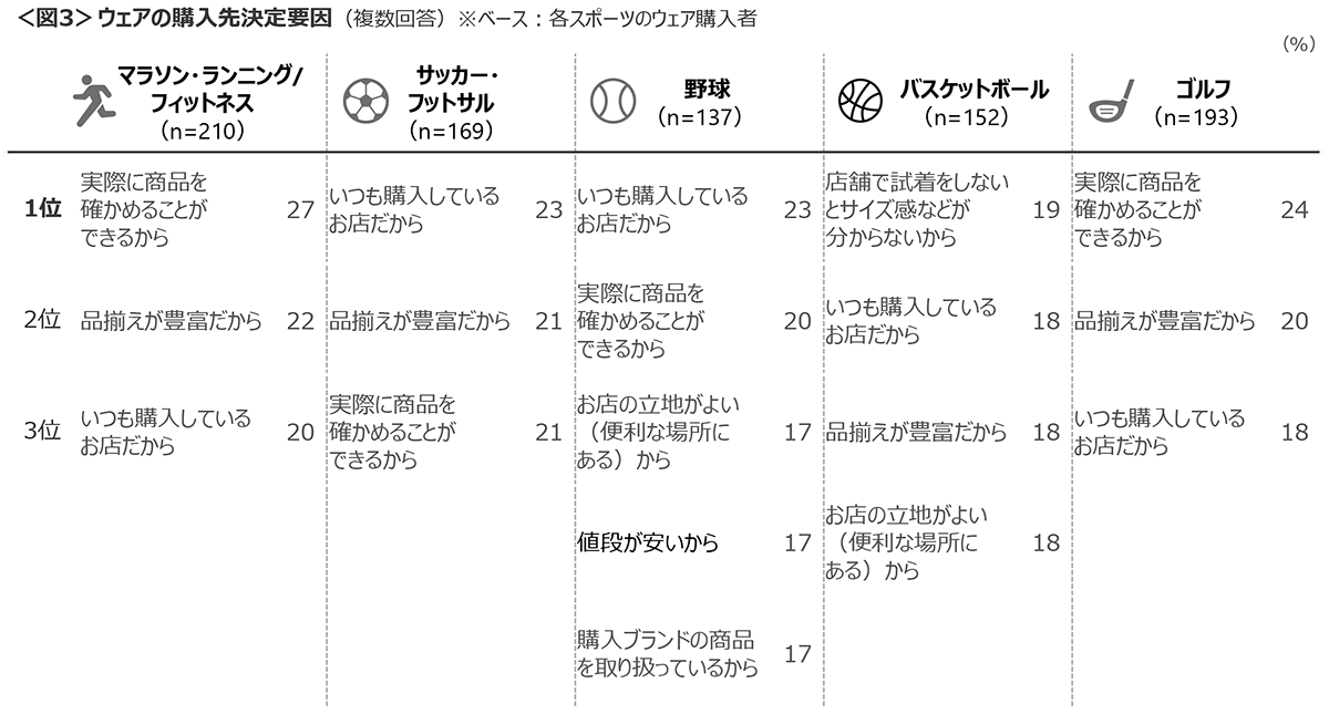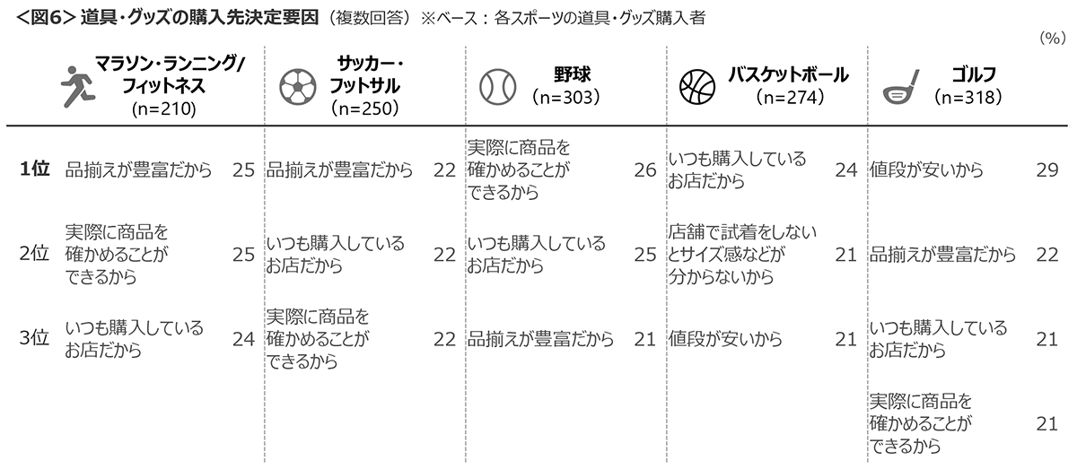 購入先の決定要因は、「品揃えが豊富」「実際に商品を確かめることができる」「いつも購入しているお店」がランクイン。ゴルフでは「値段が安い」が29%と1番手にあがった。<図6>