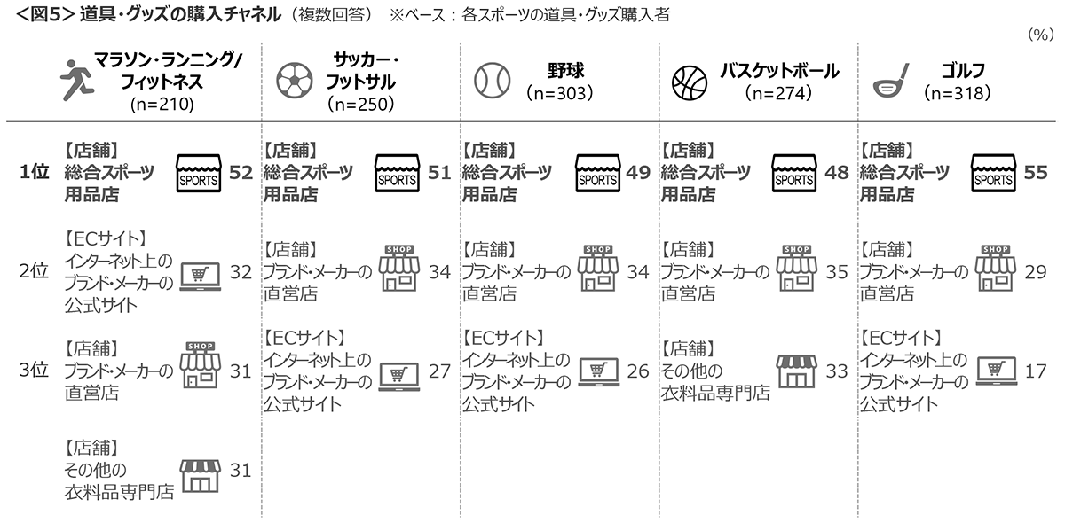 グローブやボールなどの道具やバッグなどのグッズの購入先は、ウェアと同様にいずれのスポーツも「総合スポーツ用品店(店舗)」が約5割でトップであり、「ブランド・メーカーの直営店(店舗)」が続く。<図5>